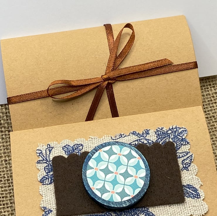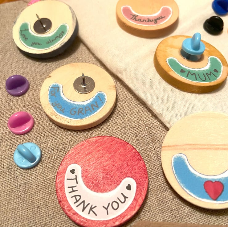The wooden pin is 3.4cm in diameter. It's presented with card board backing when folded is 10.5cm length and 7.3cm width. It is gift wrapped in a card folder with a ribbon which you can untie and write your own message. I include a free notelet if you don't want to write on the brooch packaging. If you want to say a message on the back there is a list of ready made ones for you to choose. If you want a particular name to be added on the back then contact me via the "Note to seller" option at checkout . Thanks for looking at my brooches!