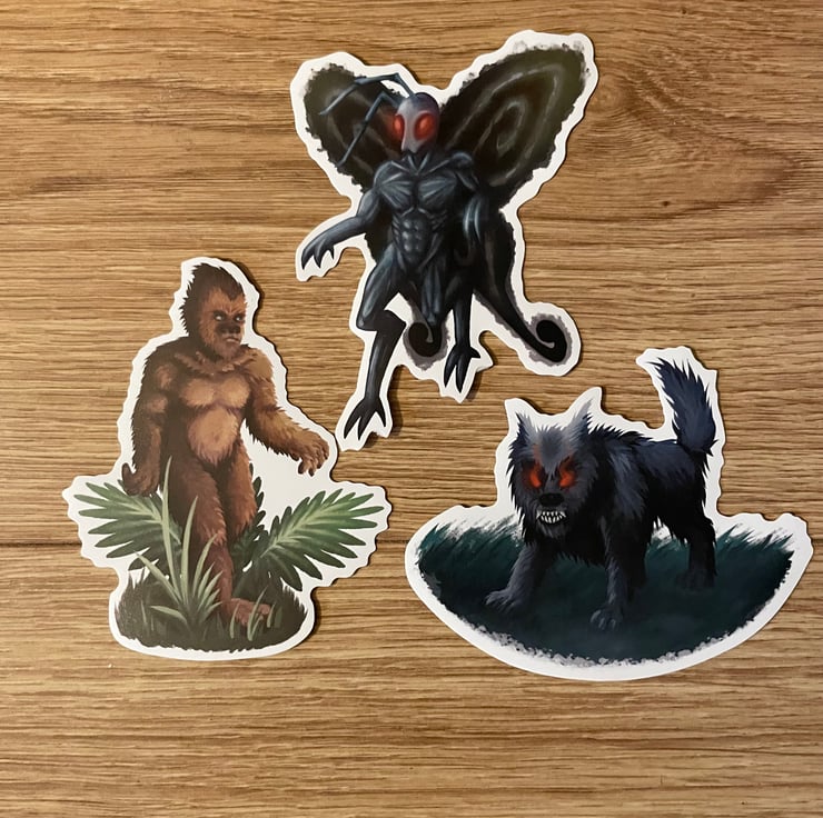 A quirky trio of 10cm by 10cm creature stickers. 100 microns thick, high quality monomeric white vinyl with a clear permanent acrylic adhesive, with residue-free removal. Suitable for indoor and outdoor use.