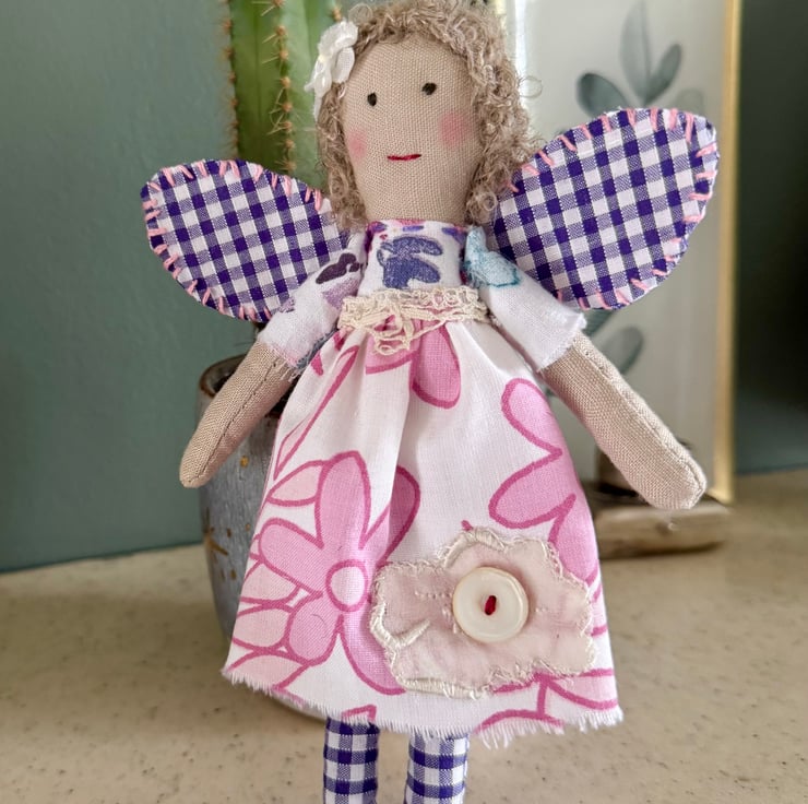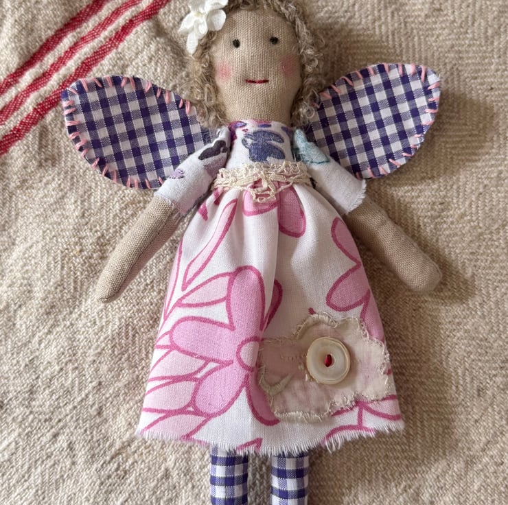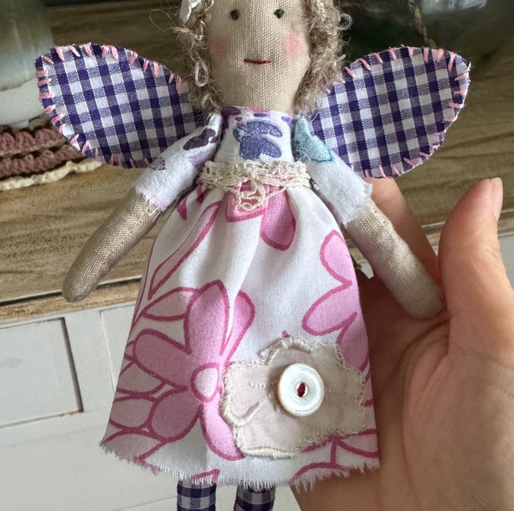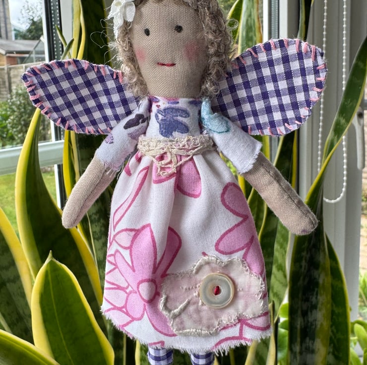 The body has been stitched using my vintage Singer sewing machine, the clothes and wings are slow stitched using deliberate, gentle hand stitching
