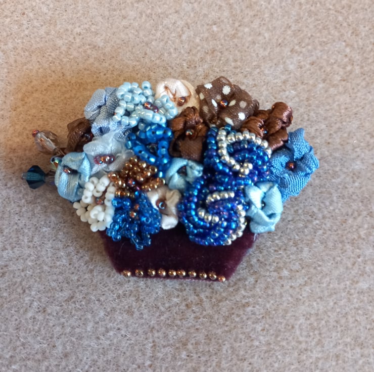 Cute basket of flowers shaped brooch. Handmade using beads and ribbon.