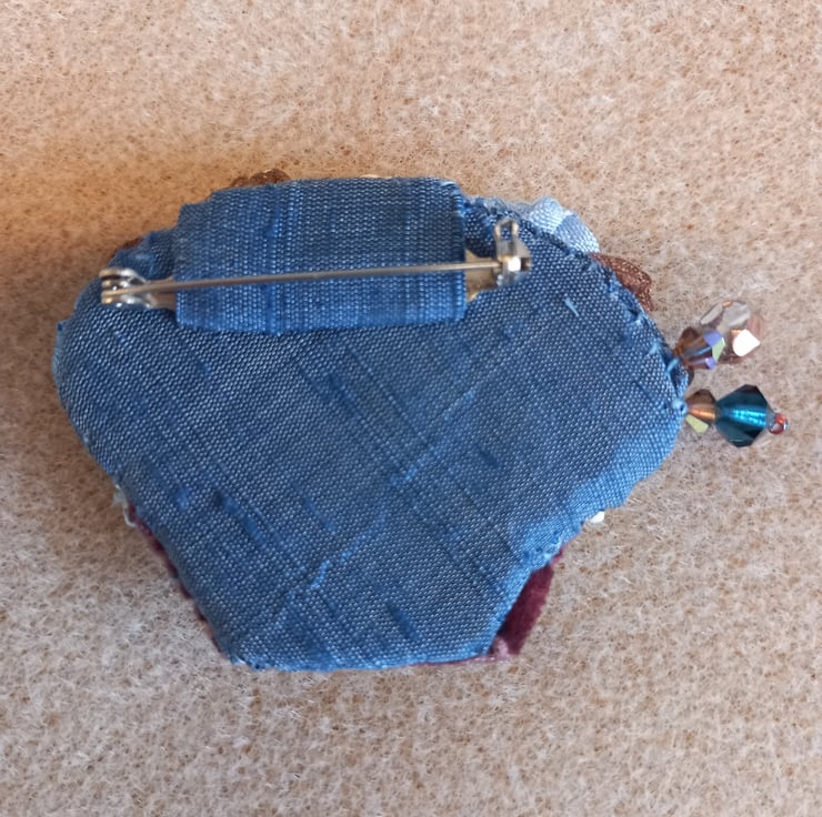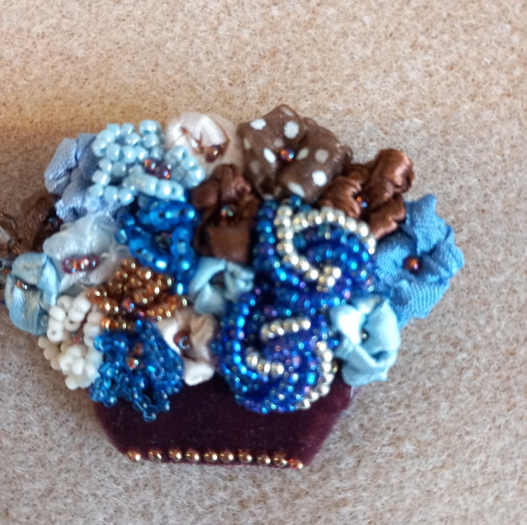 Cute basket of flowers shaped brooch. Hand made using beads, and ribbons. There is a silk back with brooch pin attached.