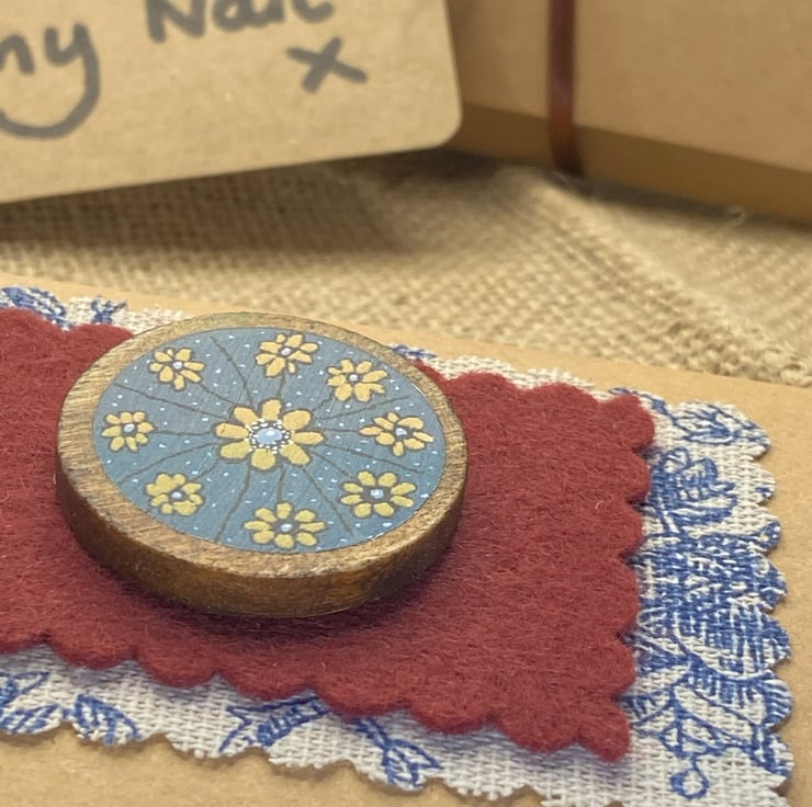 The wooden pin is 3.4cm in diameter. It's presented with card board backing when folded is 10.5cm length and 7.3cm width. It is gift wrapped in a card folder with a ribbon which you can untie and write your own message. I include a free notelet if you don't want to write on the brooch packaging. If you want to say a message on the back there is a list of ready made ones for you to choose. If you want a particular name to be added on the back then contact me via the "Note to seller" option at checkout . Thanks for looking at my brooches!