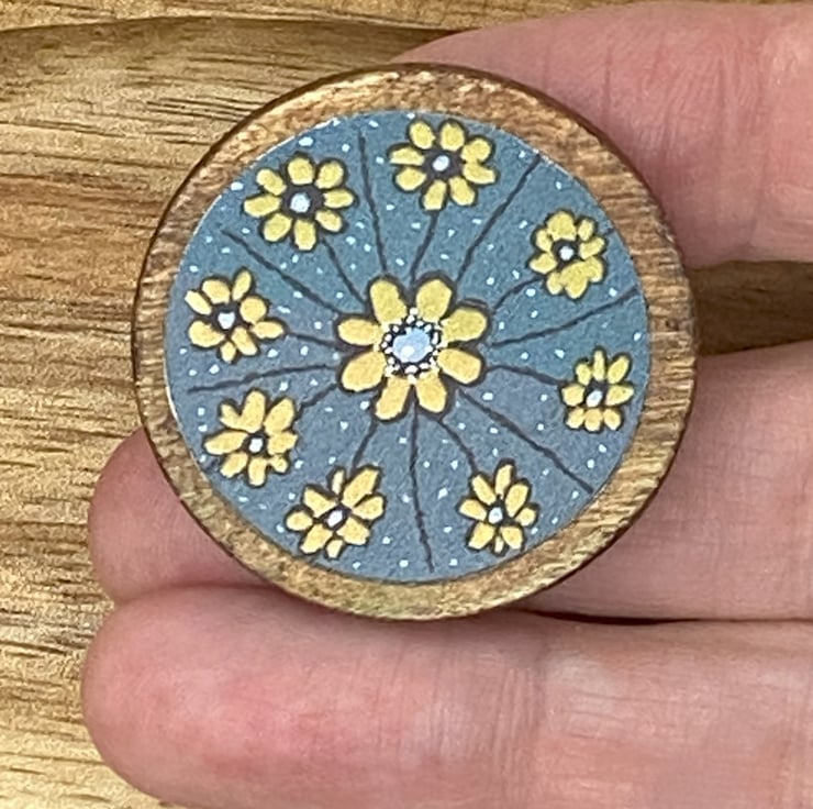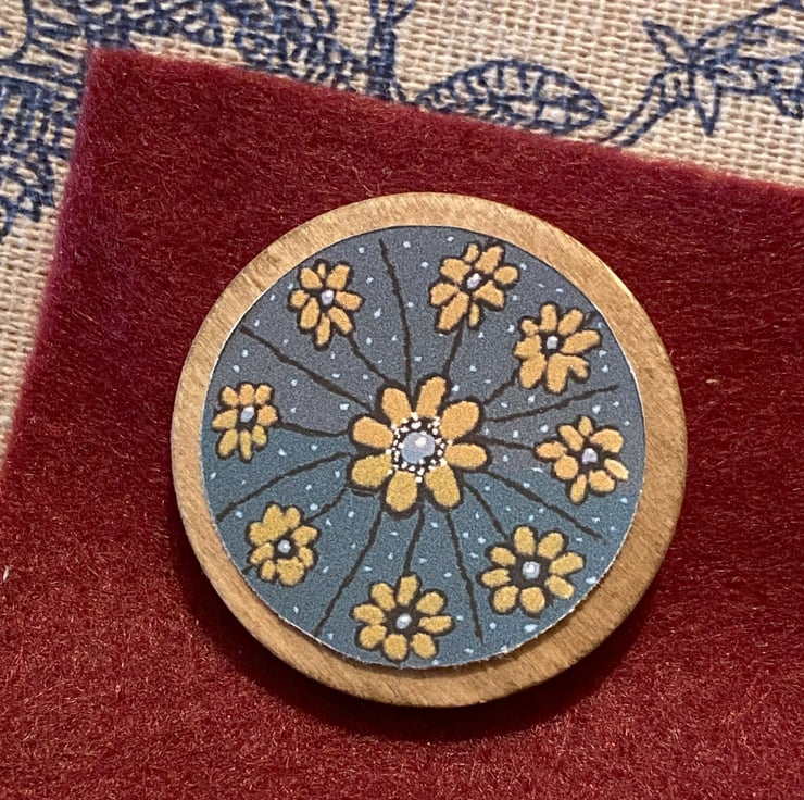 A spidery flower design with sparkles. I designed this brooch with an autumn feel. When making a brooch I print the design onto a wooden transfer paper and hand paint the wooden disc with a water colour. I varnish it before and after placing the wood transfer. I also enjoy matching the fabric I use for the brooches display card.