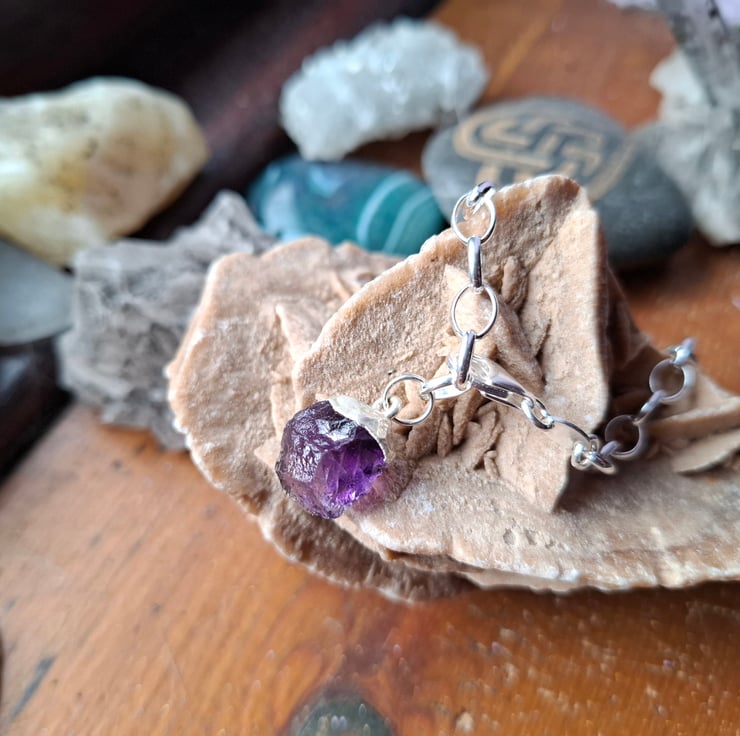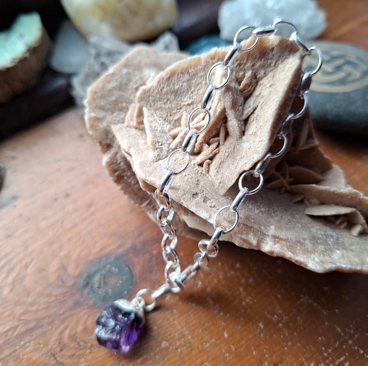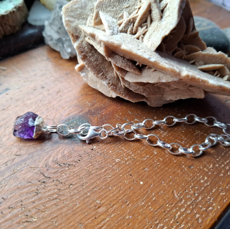This gorgeous raw Amethyst has been capped in sterling silver, hangs from an up to 7.5 inch sterling silver large belcher chain (you just fasten it at your desired length, but I could add jump rings to lengthen it slightly, please comment or contact me to check). The simple beauty of the crystal is maximised in this format, the purple comes alive as the light hits it, showing its depth of colour. Each is individual and are approximately 1.5 - 2cm in length.