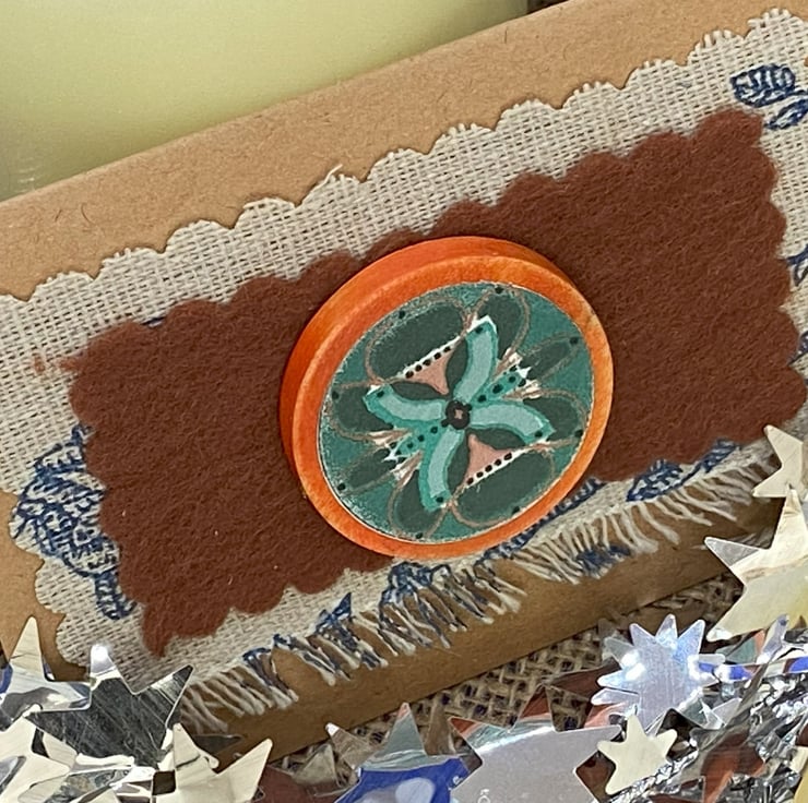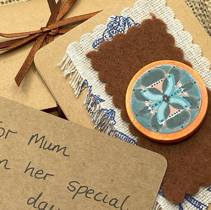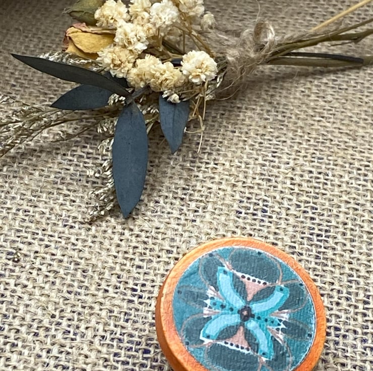 A cute pattern that sometimes seems to be a flower and other times looks like a butterfly. 2 in 1! Wooden circle for the base with pin for fastening. Ideal gift for gran (or nan!) who might like flowers and butterflies. The turquoise and oranges go well together. Perhaps give this as Thank you with a special message on the back. If you want a particular message then just click on contact the seller at the checkout. It comes displayed with burnt brown felt back and frayed hessian type material - all good for the hand made feel vibe! Thanks for your interest.