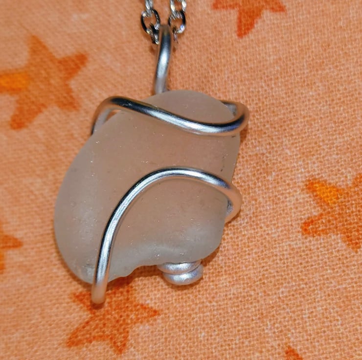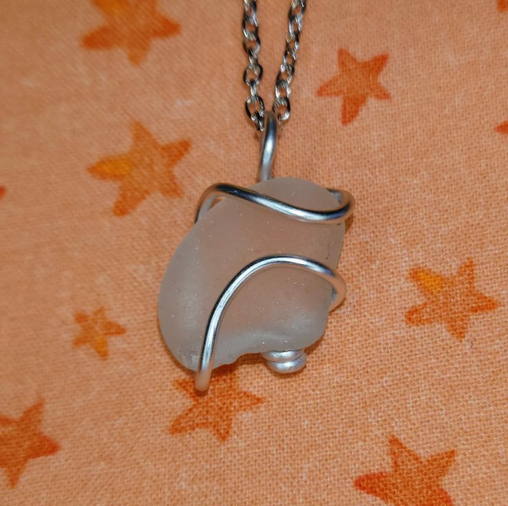 One of a kind dorcel Fin shaped white sea glass pendant 1.5 inches set in aluminium wire on a 19 inch silver coloured chain.