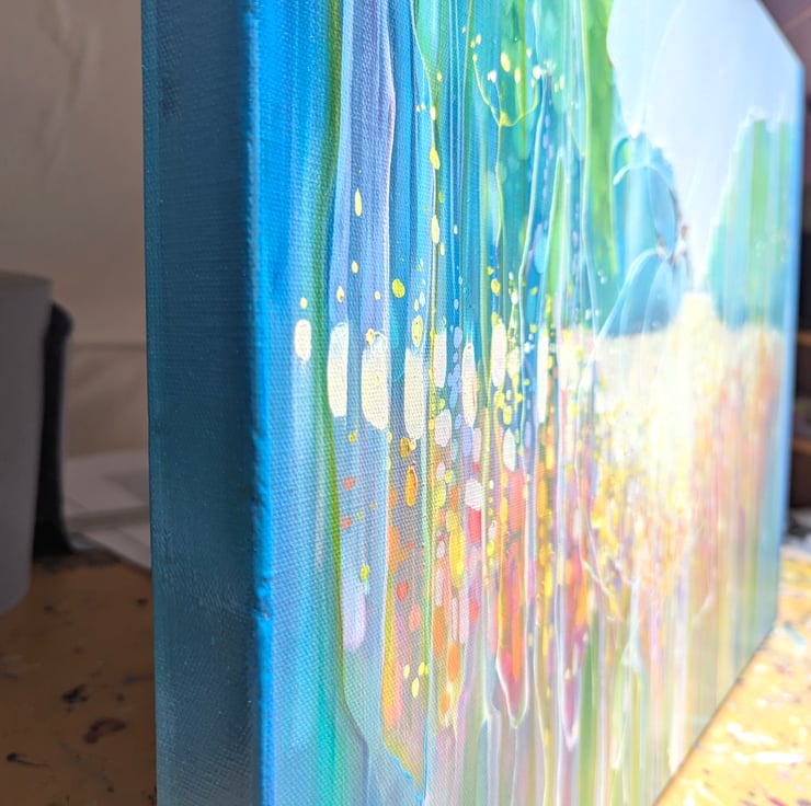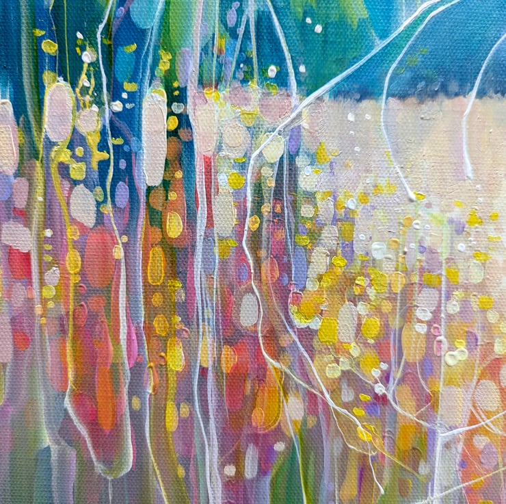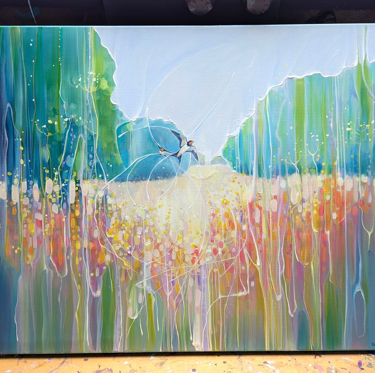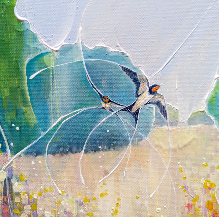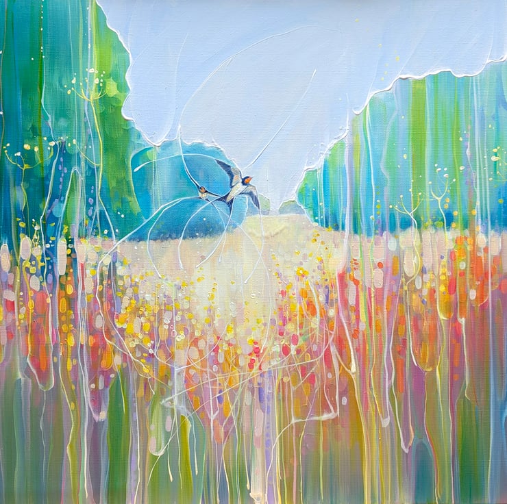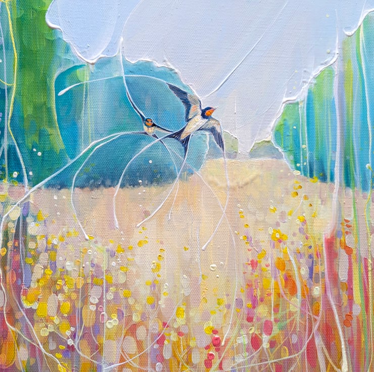 Summer Dance is a semi-abstract, art-nouveau style oil painting of a summer meadow with swallows dancing over it and forming patterns in the landscape. It is 24x18x1.5 inches. The painting was made after much walking around in meadows in Sussex during June and July watching swallows swooping and diving for the insects that gather over the wild flowers and trees. Swallows move so fast they are hard to keep track of and they tend leave patterns on the eyes (mine anyway) which adds to the feeling of energy that I tried to capture in this painting. Painted on 3D canvas, blue edges, ready to hang and comes with certificate of authenticity.