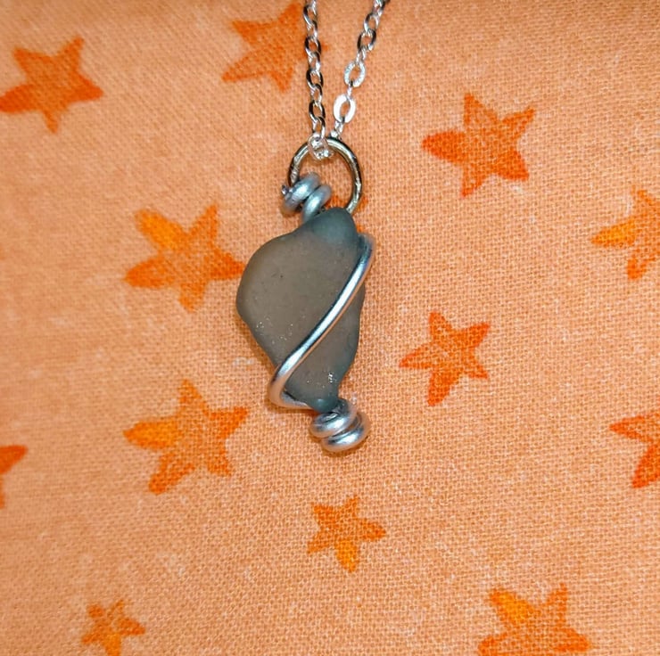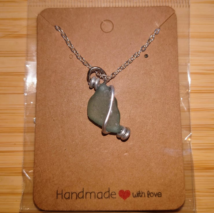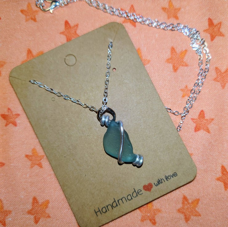 One of a kind 2cm turquoise sea glass pendant set in aluminium wire on a 19 inch silver coloured chain.