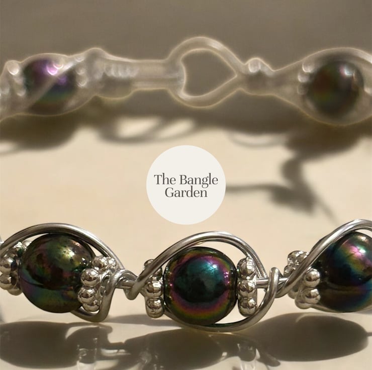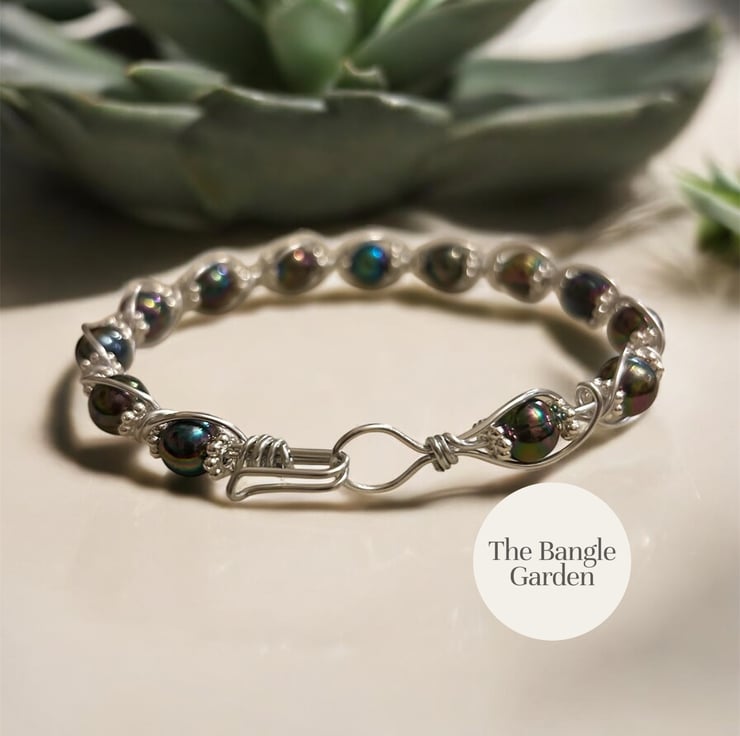 Handmade wire wrapped bangle. Made with 1mm aluminium wire and decorated with 8mm variegated glass beads and 4mm silver spacers,