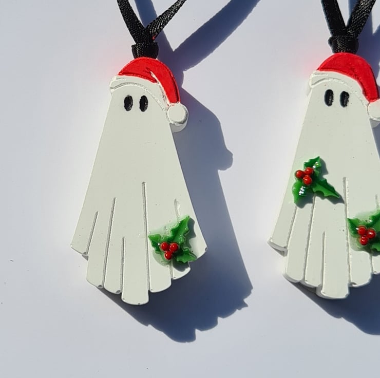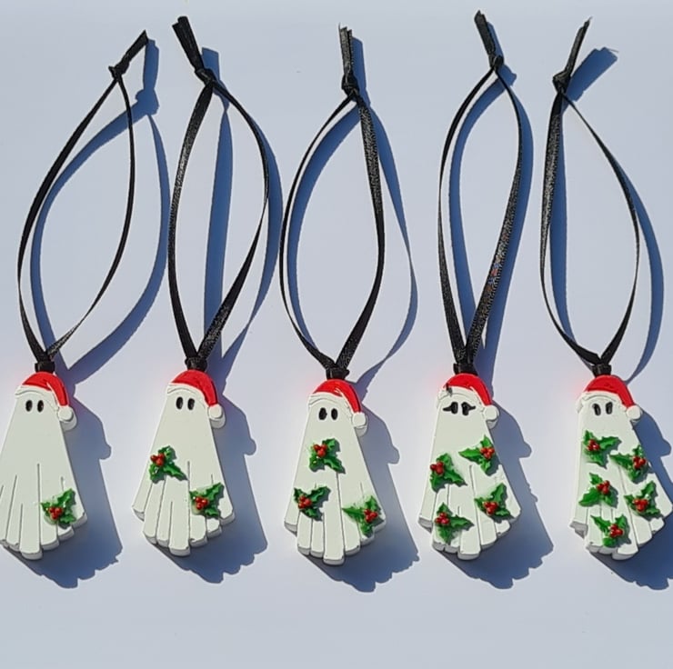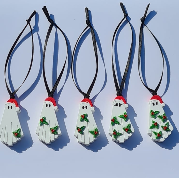 An unusual set of five handmade Christmas Ghost ornaments, lovely decorations, hanging on black ribbons. Each little spook has holly adornments and painted Santa Hat. Made from Eco-resin (Resin-crete).