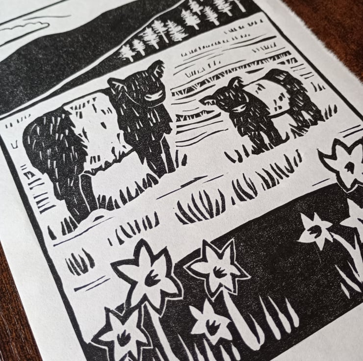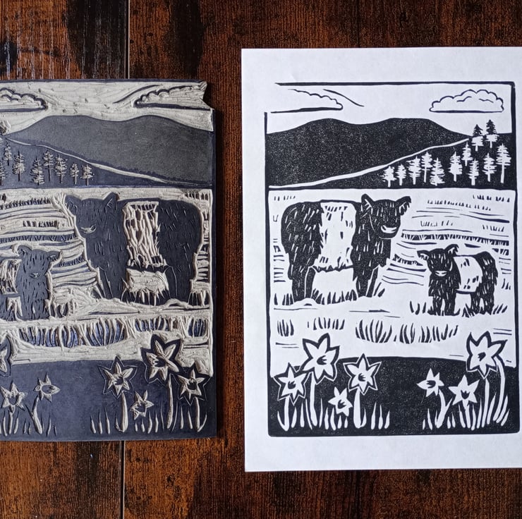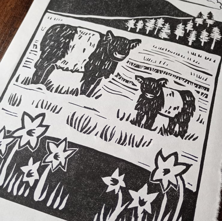 I made this lino print following a visit to the Lake District in springtime. I had been looking for inspiration for printmaking, and when I saw the black and white Belted Galloway cows grazing at Tarn Hows I thought they would make the perfect subject.