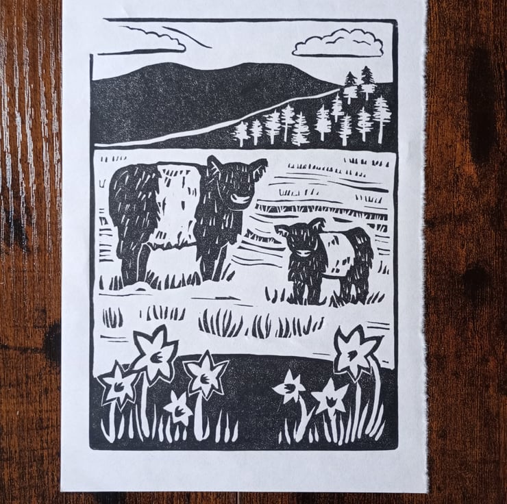 An original lino block print of Belted Galloway cows in the Lake District. Inspired by a spring time visit to Tarn Hows, which is near Hawkshead and Ambleside.