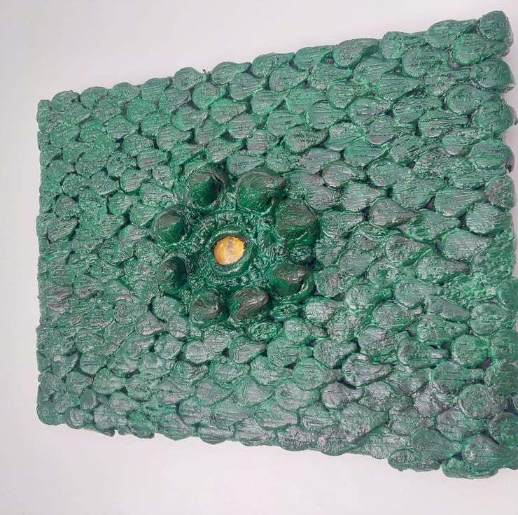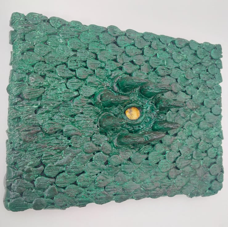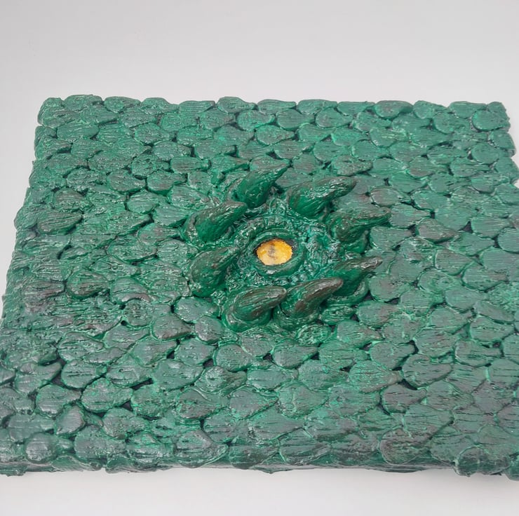 This dragon has been handcrafted in clay painted in acrylics and varnished on canvas.
