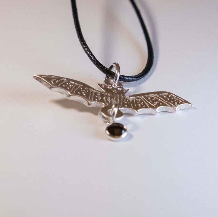 Handmade silver bat necklace with adjustable cord with black onyx gemstone