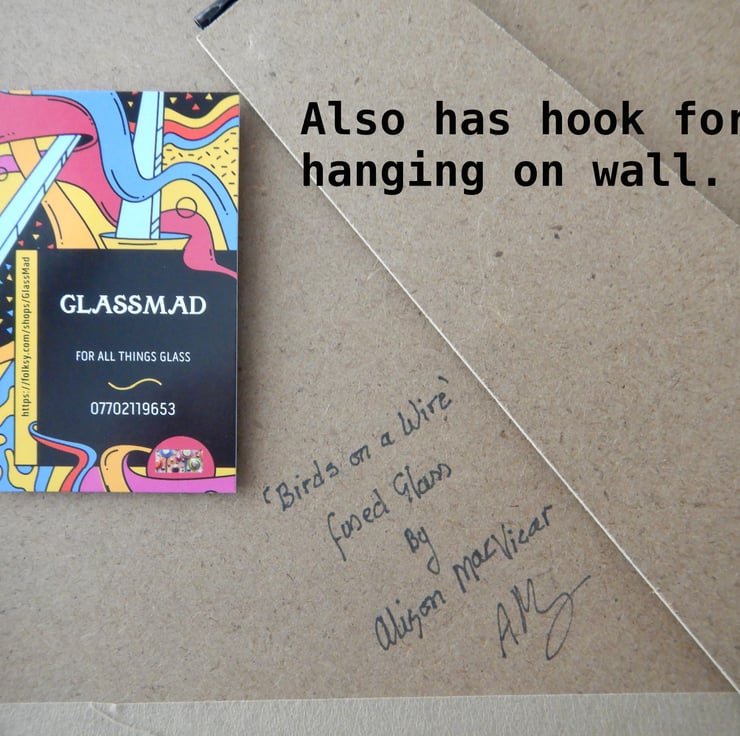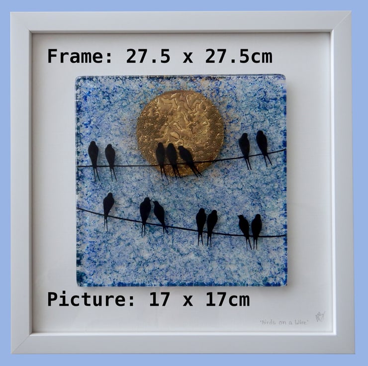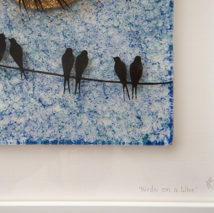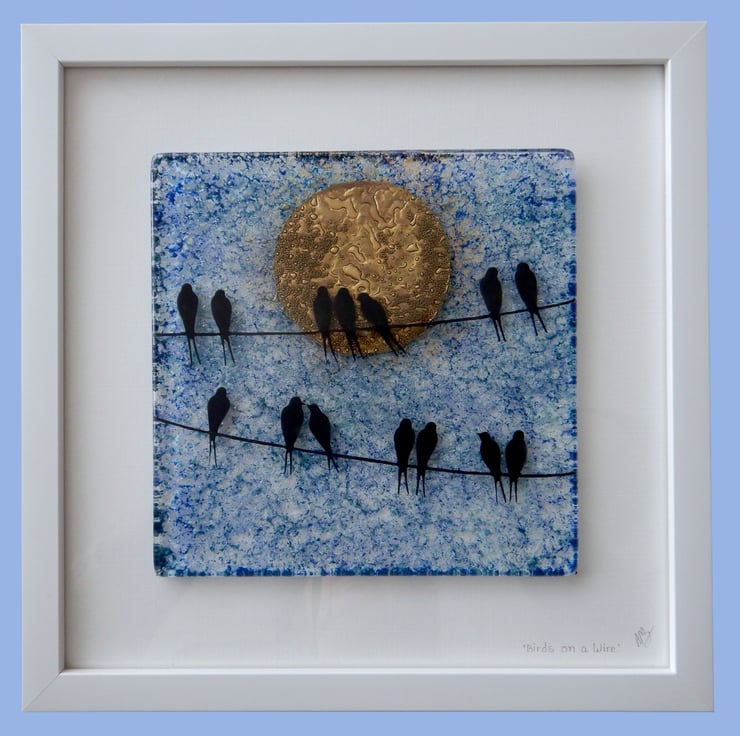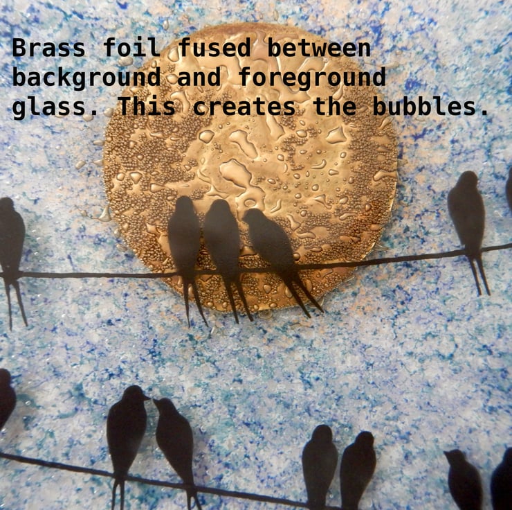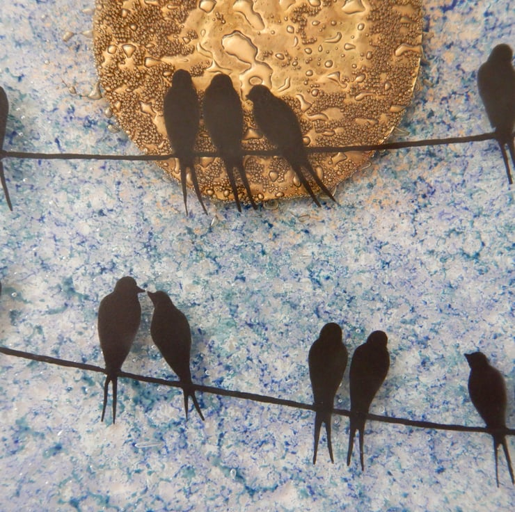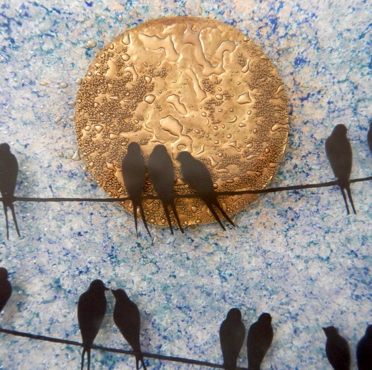 This picture has three layers, two being bullseye glass, and one being a brass metal moon. The moon is sandwiched between the two layers of glass. This gives the brass a bubbly mottled appearance (quite atmospheric). The birds and their wire are carefully painted on using 'glassline'. Once again 'glassline is used to give the mottled background sky. The finished piece was then fused twice in my glass kiln to allow the layers to melt and blend together. Each firing took thirteen hours.