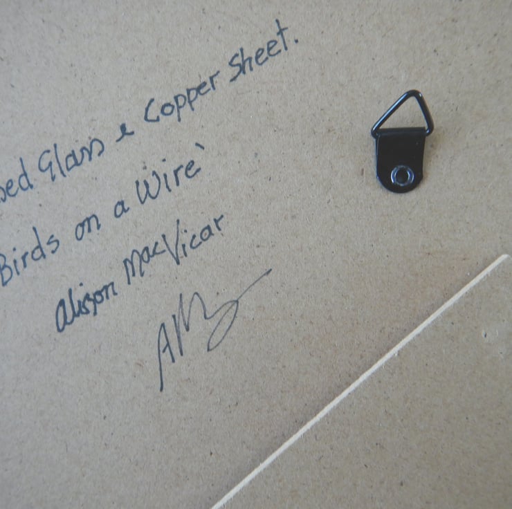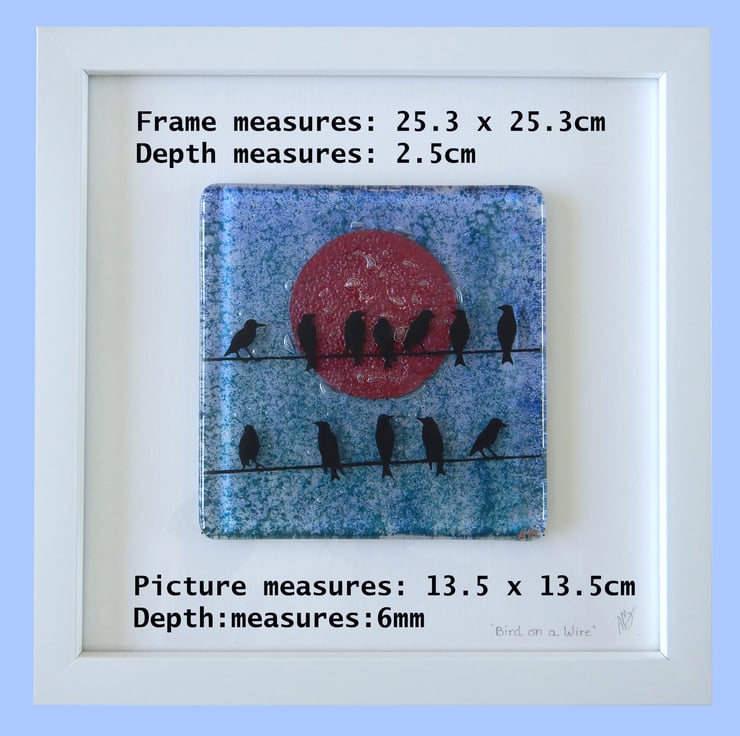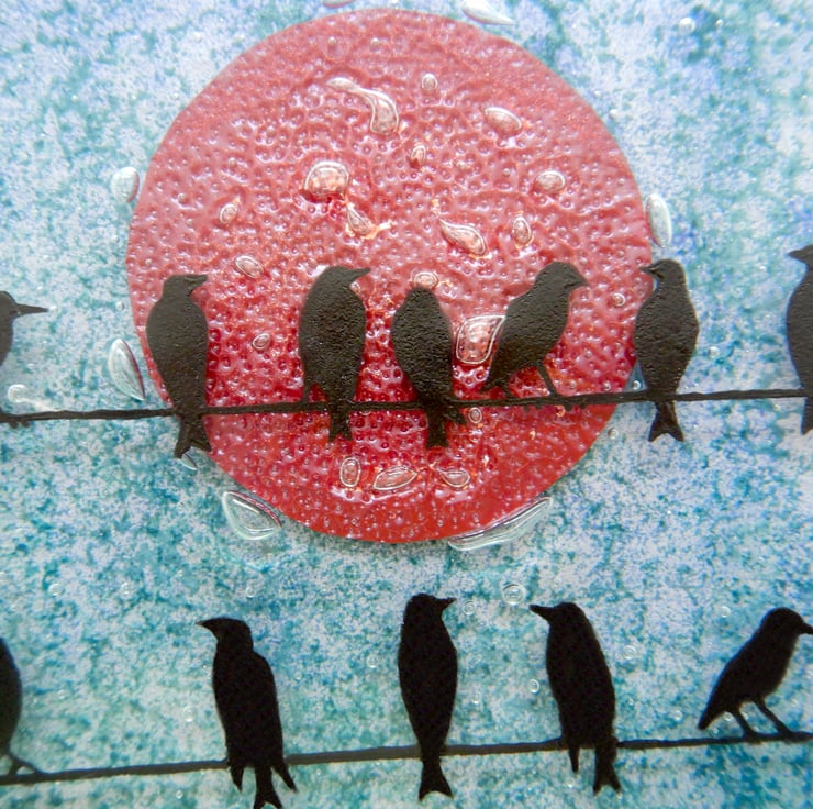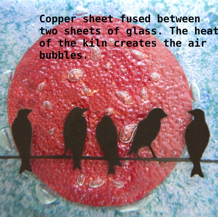 This picture has three layers, two being bullseye glass, and one being a copper metal moon. The moon is sandwiched between the two layers of glass. This gives the copper a bubbly mottled appearance (quite atmospheric). The birds and their wire are carefully painted on using 'glassline'. Once again 'glassline is used to give the mottled background sky. The finished piece was then fused twice in my glass kiln to allow the layers to melt and blend together. Each firing took thirteen hours.