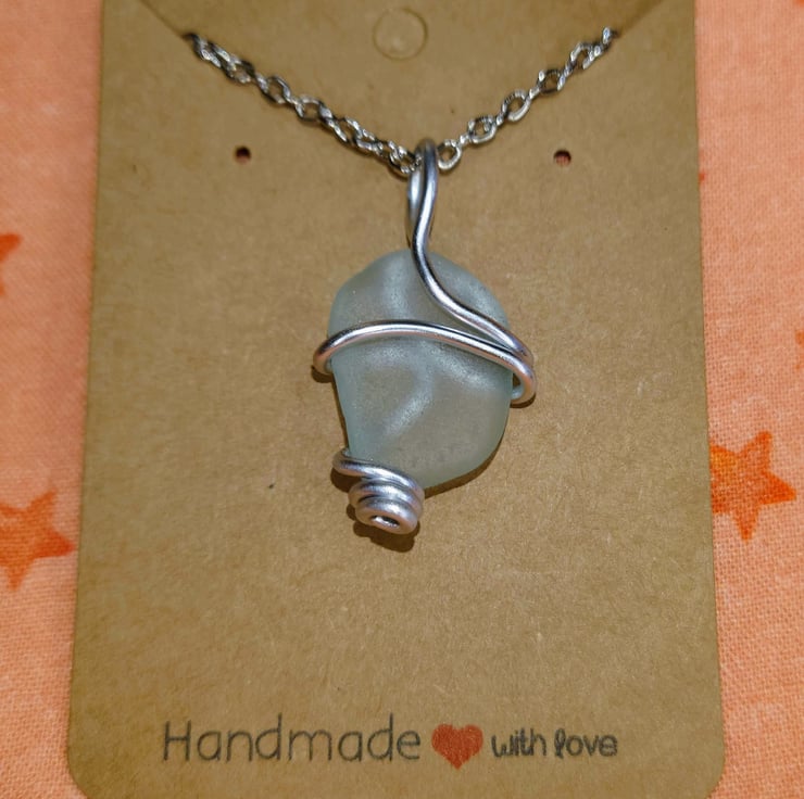Pebble shaped turquoise sea glass pendant entwined in aluminium wire set on a silver coloured chain.