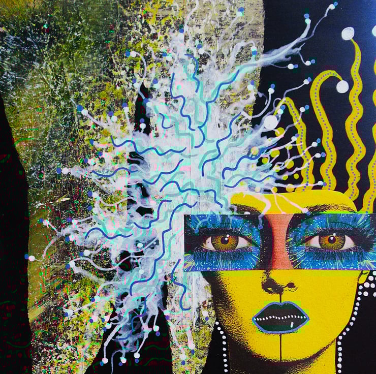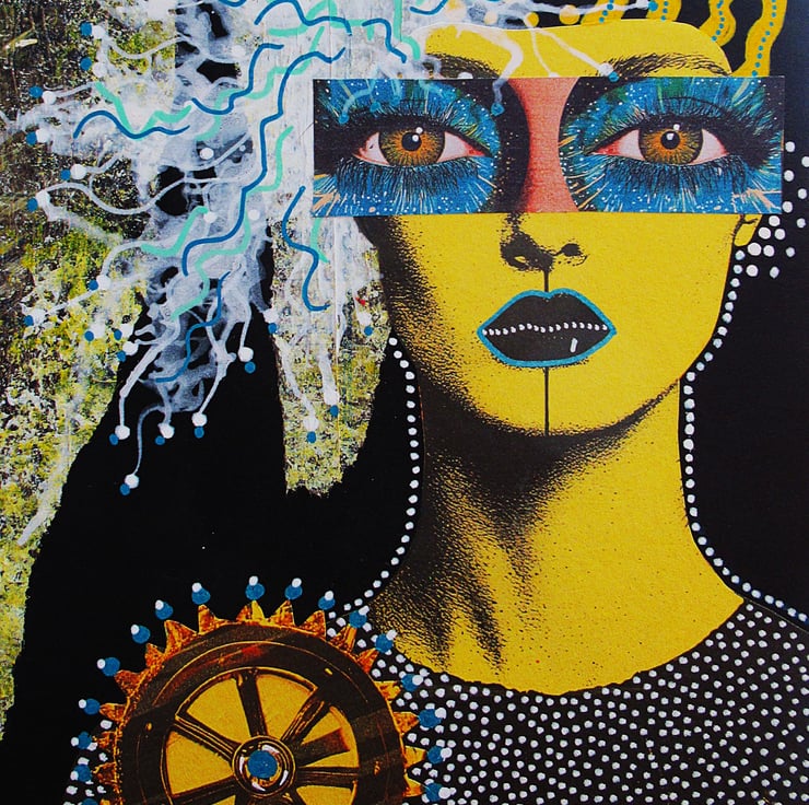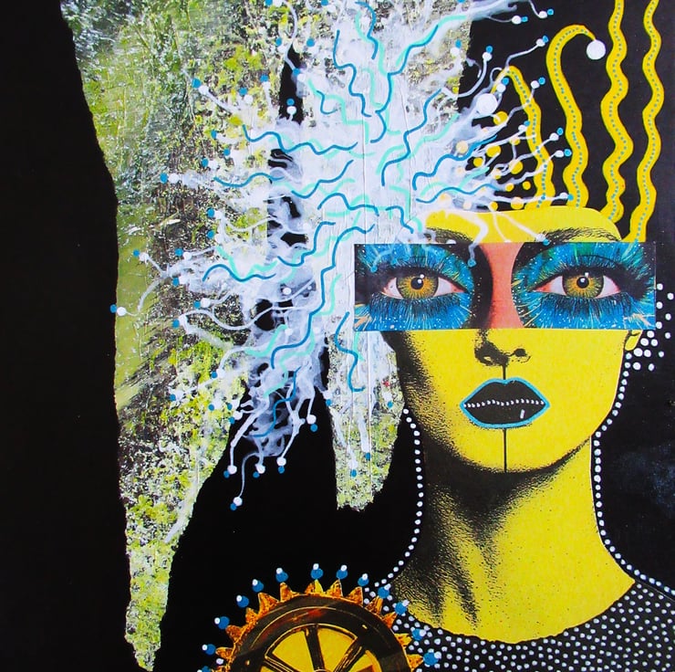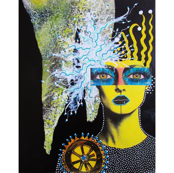 Transform your room with this surreal female portrait - a unique, original mixed media artwork that blends futuristic visionary art with dreamlike surrealism. This bold piece of art depicts a vibrant yellow figure with bold blue eyes, dynamic cosmic energy bursts, and intricate steampunk-inspired details, making it a perfect statement art piece for living rooms, offices, or gallery walls. Ideal for art lovers who appreciate unique, thought-provoking wall decor, it’s more than just a painting - it’s a conversation starter! In acrylic, collage and drawing pens, measuring 8 x 10 inches, so perfect to place straight into any standard sized 8x10" frame (or mount). It will be discreetly hand signed on the front before dispatch. Perfect for bohemian interiors, eclectic home décor, or as a unique gift for quirky art / mixed media lovers.