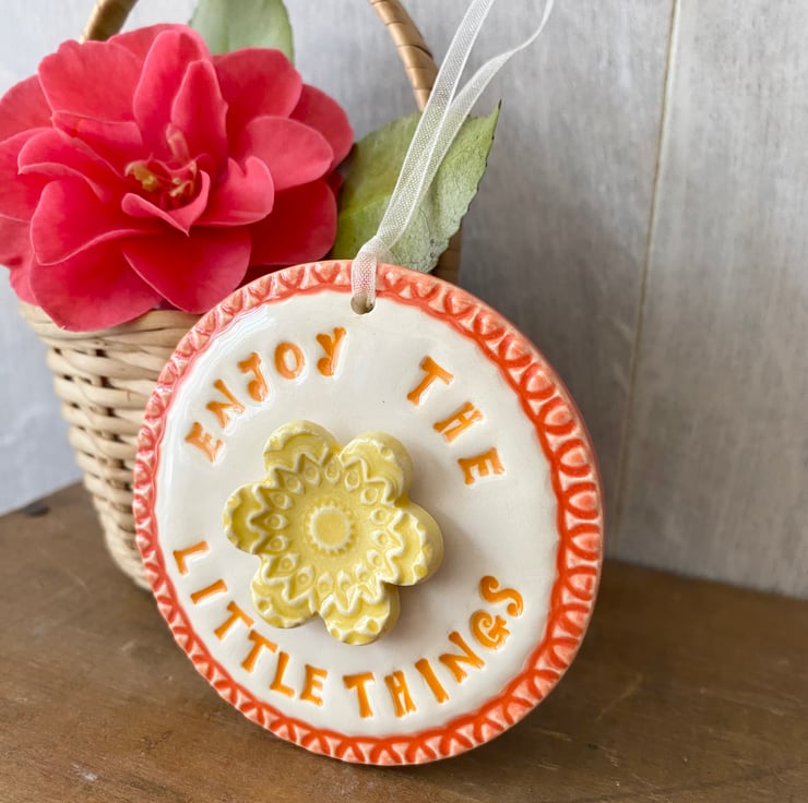 This ceramic decoration is made from white earthenware clay and finshed with a little pottery flower. It has been fired twice and finished with a glossy glaze for a lovely smooth finish. It measures 6.5cm diameter x 1cm deep and hangs from a green organza ribbon.