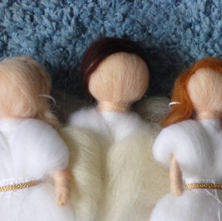 Handmade needle felted merino christmas angel. Each are made to order and feature pretty lace, ribbon and pearl detailing. Sparkly twine allows you to hang your angel or place on your tree, each being a unique decoration to your home to treasure for years to come.