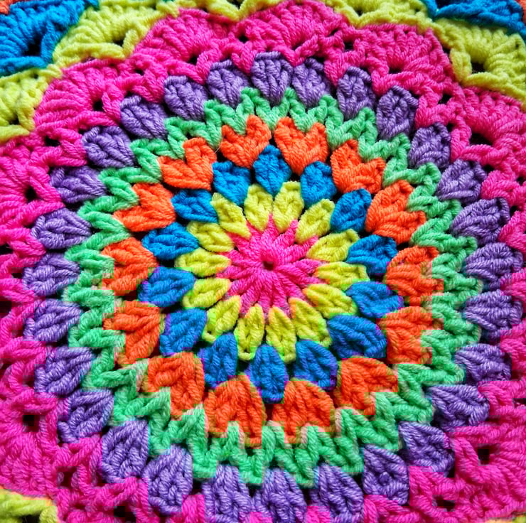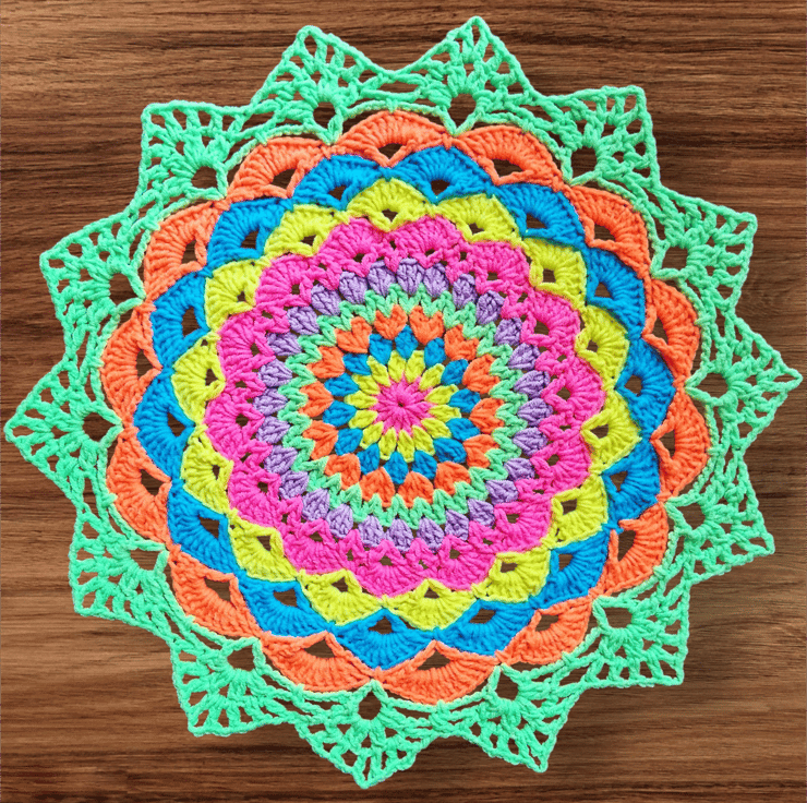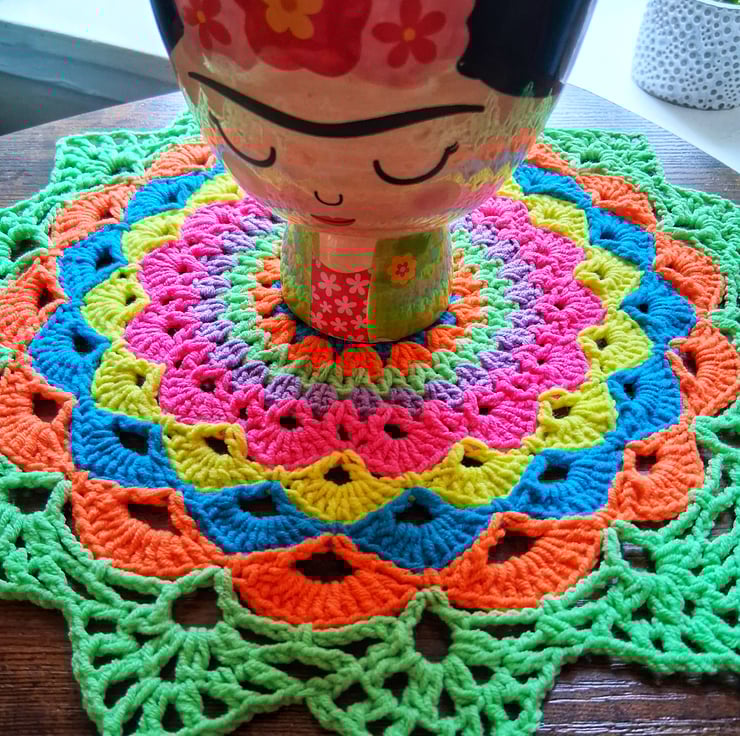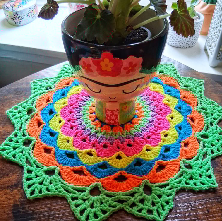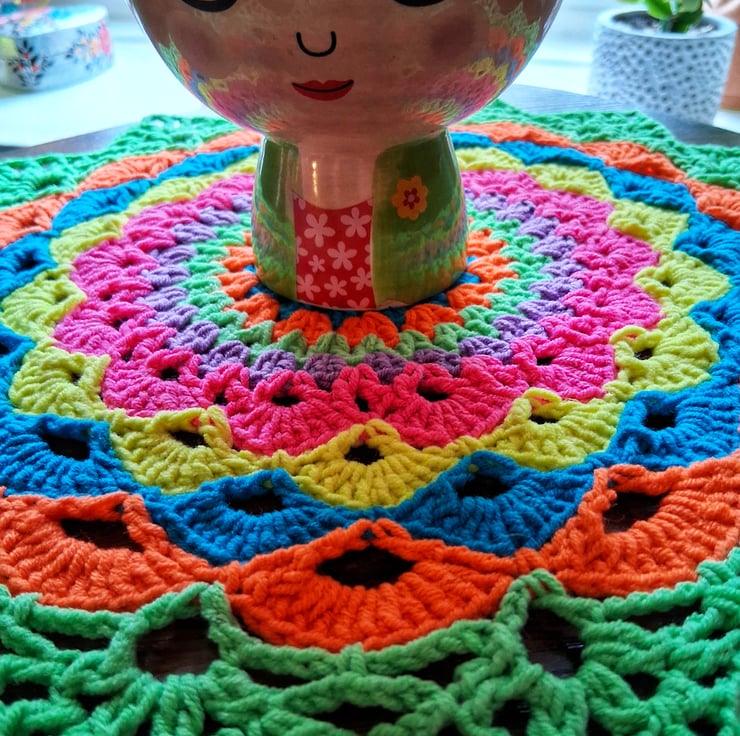 Bright crochet mandala doily. 37 cm in diameter. Perfect for giving your table a pop of colour. Crocheted in vibrant cotton blend yarn to maintain colour and ease of wash.