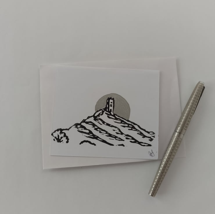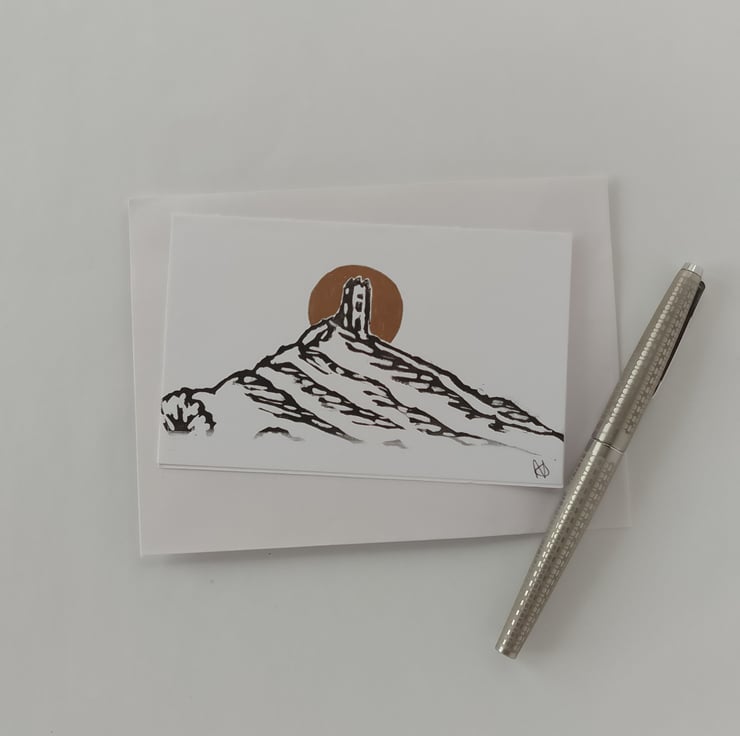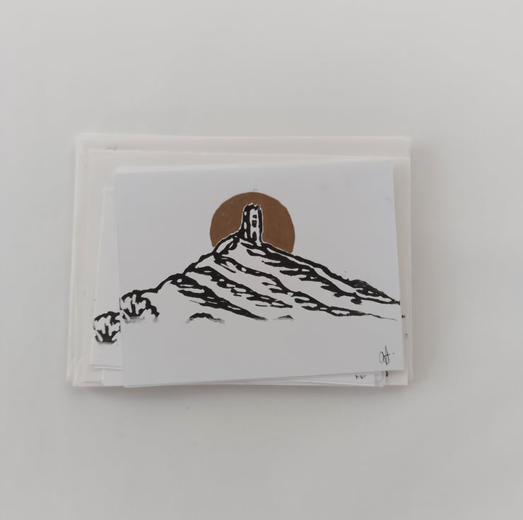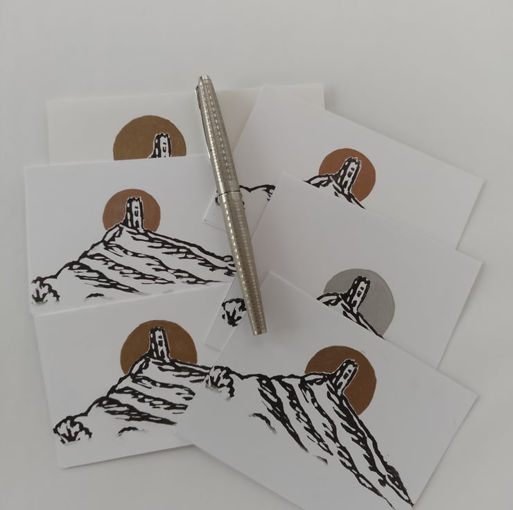 Set of 6 assorted cards featuring my original Glastonbury tor linoprint with metallic embellishments. These small hand printed cards would make great thank you or just because cards, with the bonus of an iconic Somerset scene. They are all slightly different, and come with envelopes.