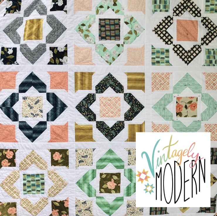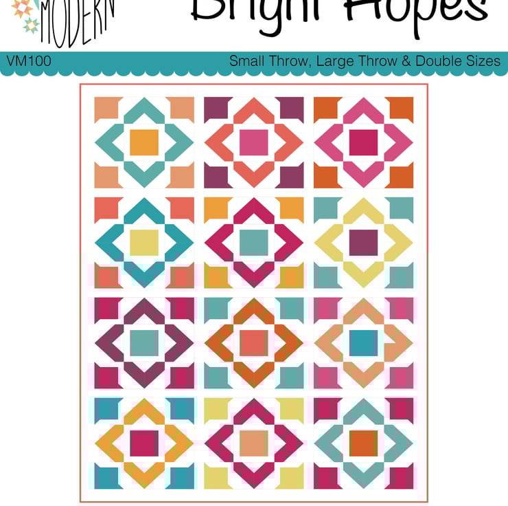 Bright Hopes is a modern, vibrant quilt featuring bold geometric shapes that beautifully highlight any fabrics you choose. Add in some floral fabrics or muted colours for some cottagecore, vintagey vibes.