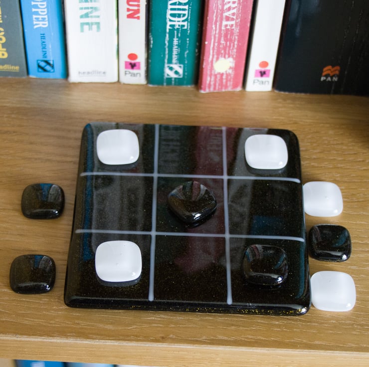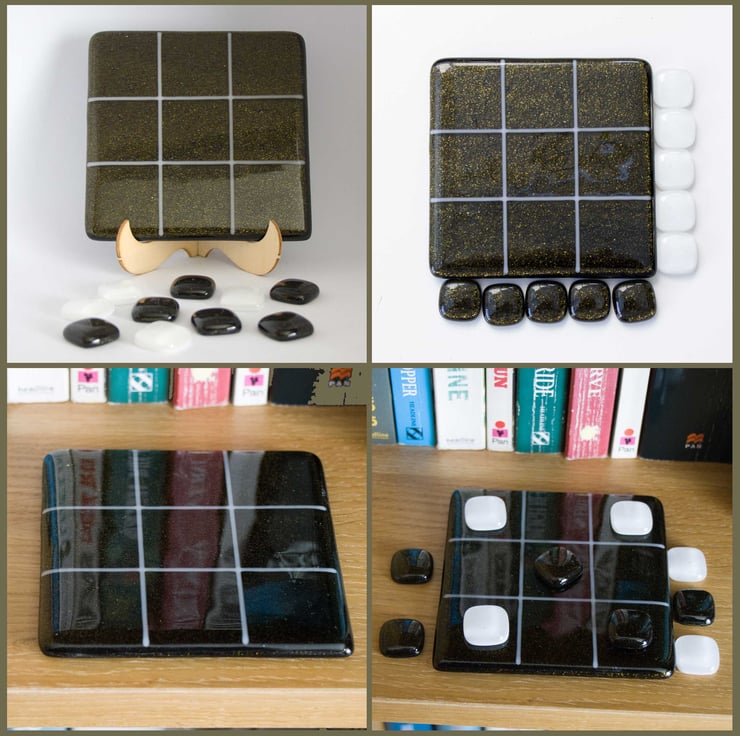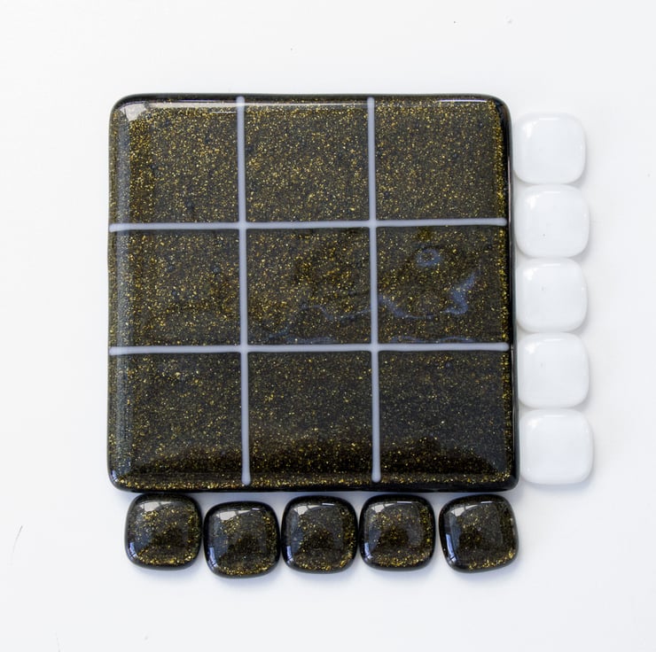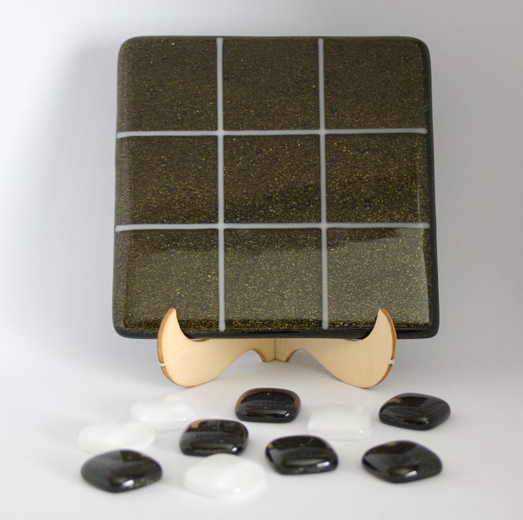 You won't need paper and pencil to play our version as we'll provide the grid on a 10 cm square coaster. The background is a lovely sparkly bronze / green with the grid made from white stringers (thin glass rods).
