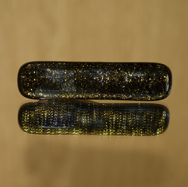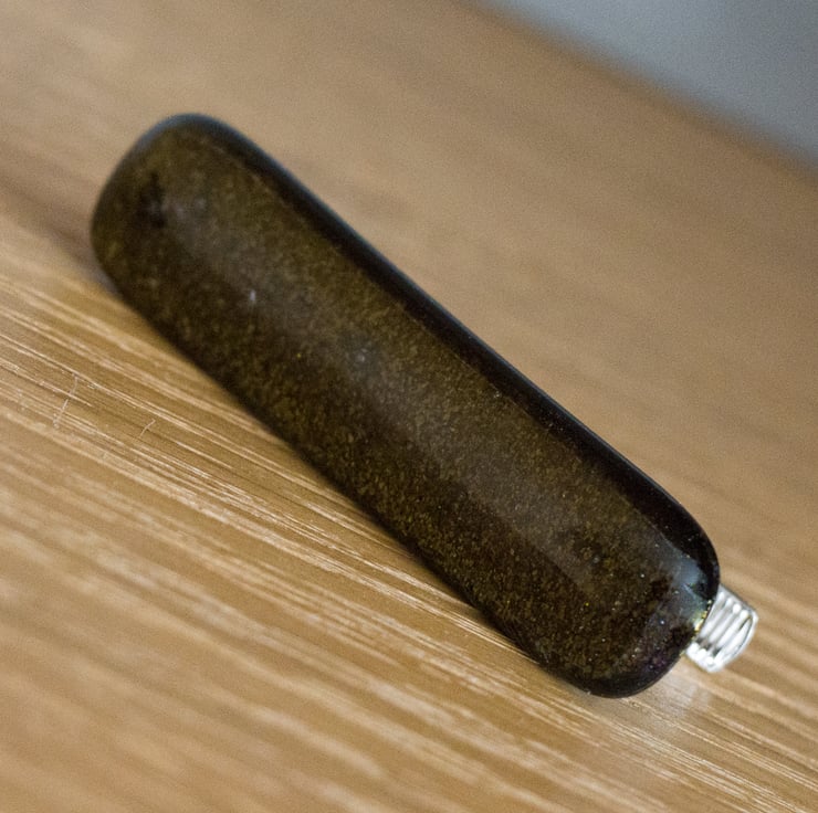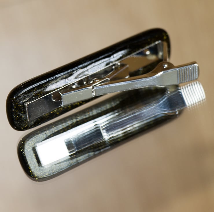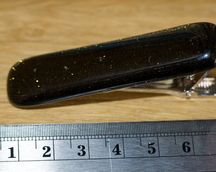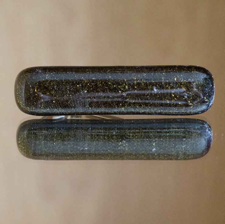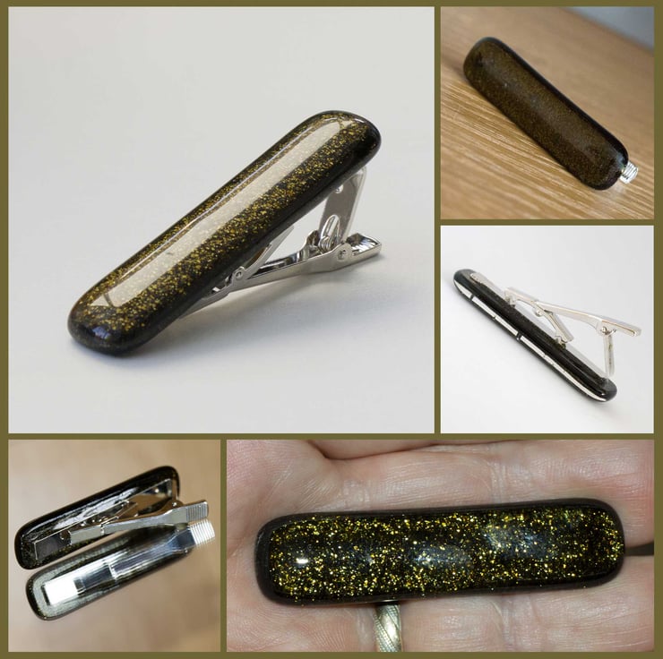 This Tie Clip is made up of a 6cm x 1cm rectangle of bronze glass capped by a piece of clear glass and fused in the kiln. It is mounted on a silver coloured metal fitting with a spring clip.
