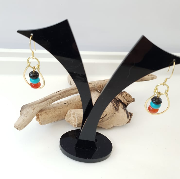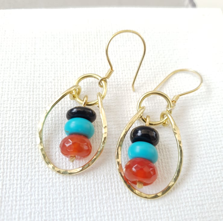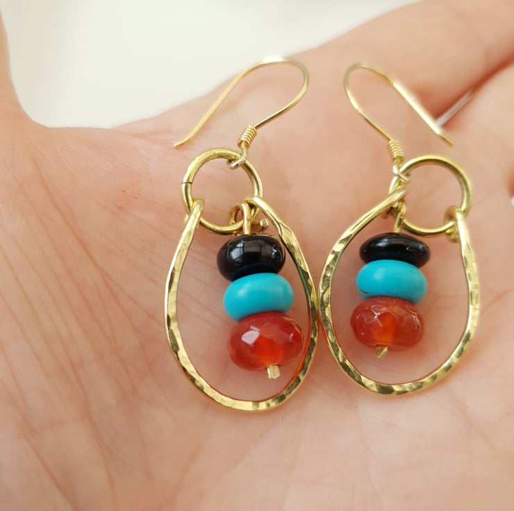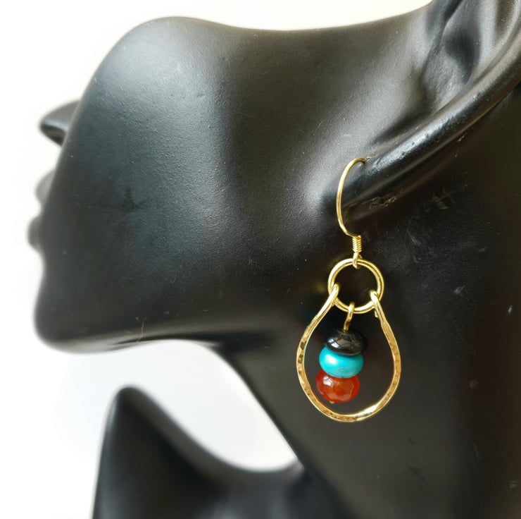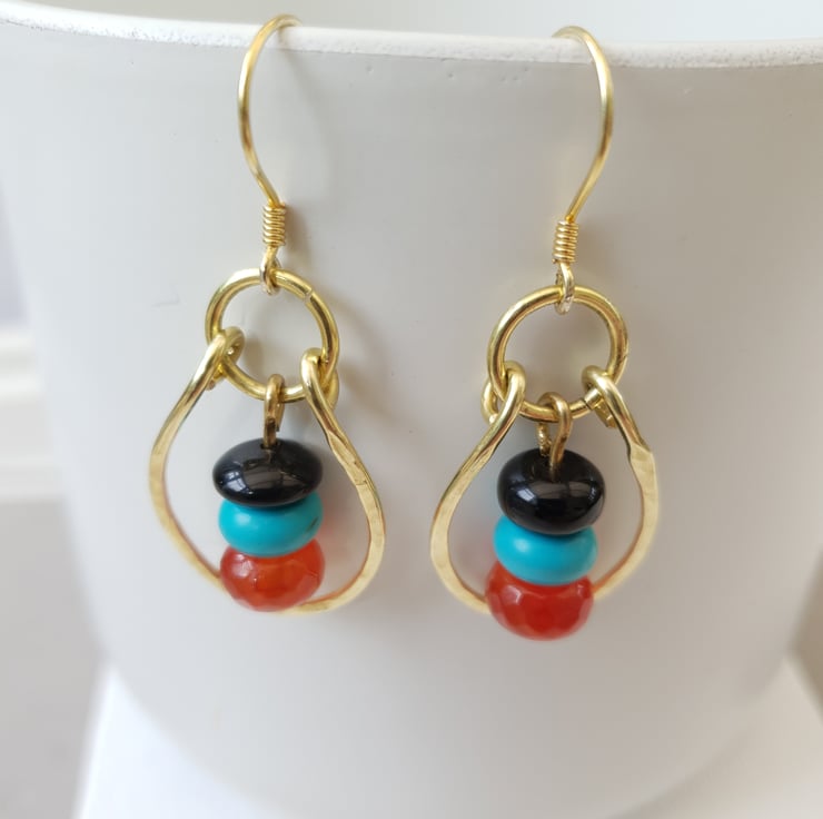 The gemstone beads were sourced from a bracelet and are black Onyx, possible Turquoise and faceted Carnelian. It is difficult to be certain of the authenticity of Turquoise, however the centre of the beads are turquoise colour rather than white so I don't believe that they are dyed Howlite which is often used these days.