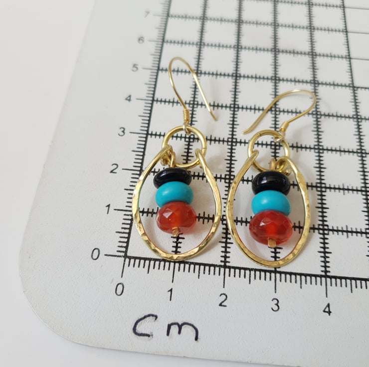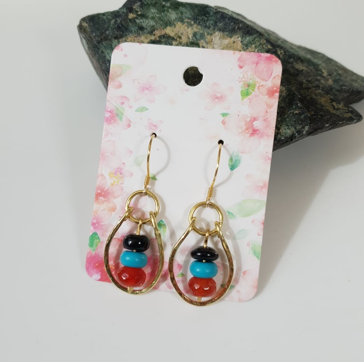 Boho Textured Brass Drop Earrings With Gemstone Dangle Gold Coloured Earrings