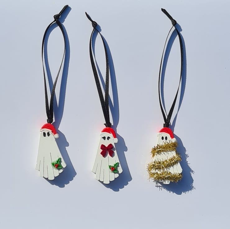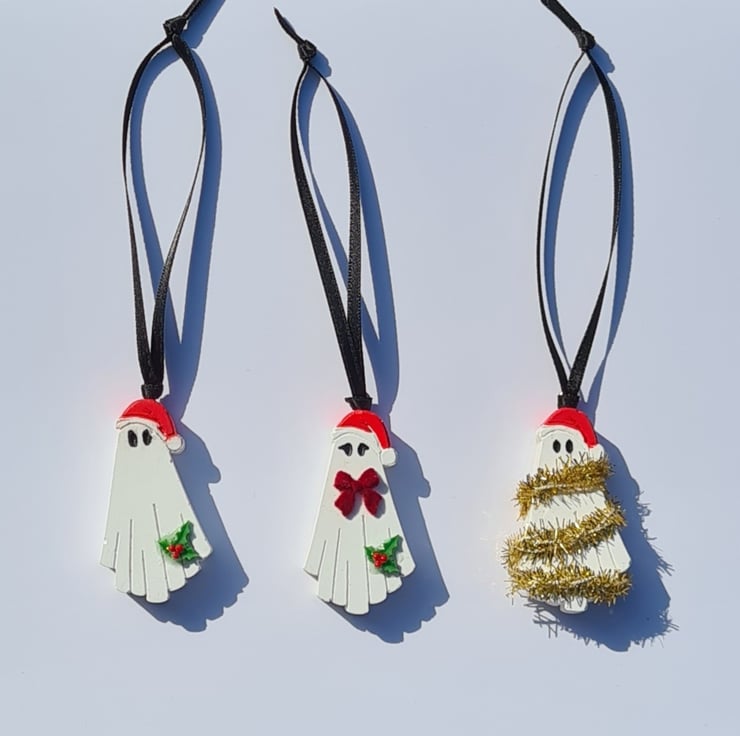 An unusual set of three handmade Christmas Ghost ornaments, lovely decorations, hanging on black ribbons. Each little spook has a different adornment, (Bow/Holly, Golden Tinsel and Holly leaf decoration) and painted Santa Hat. Made from Eco-resin (Resin-crete).