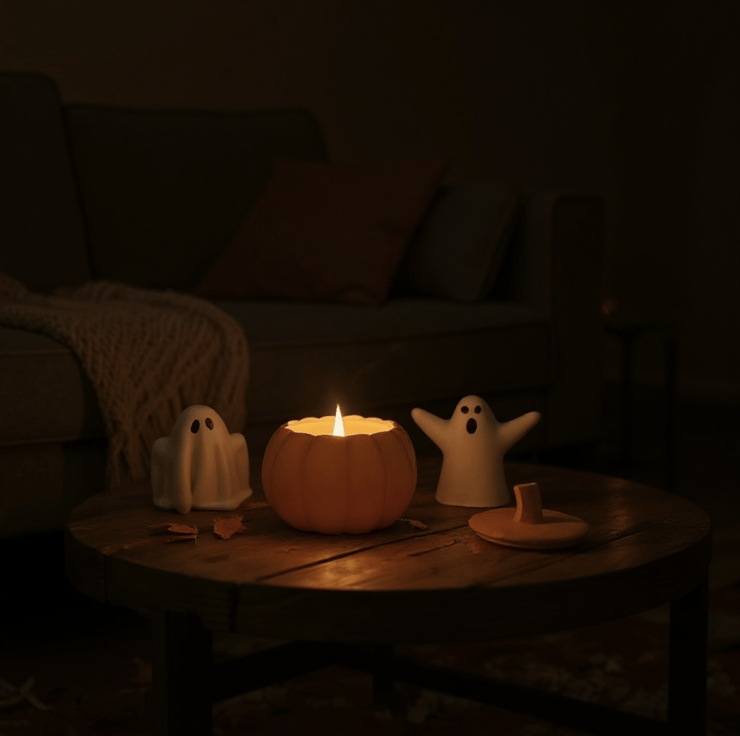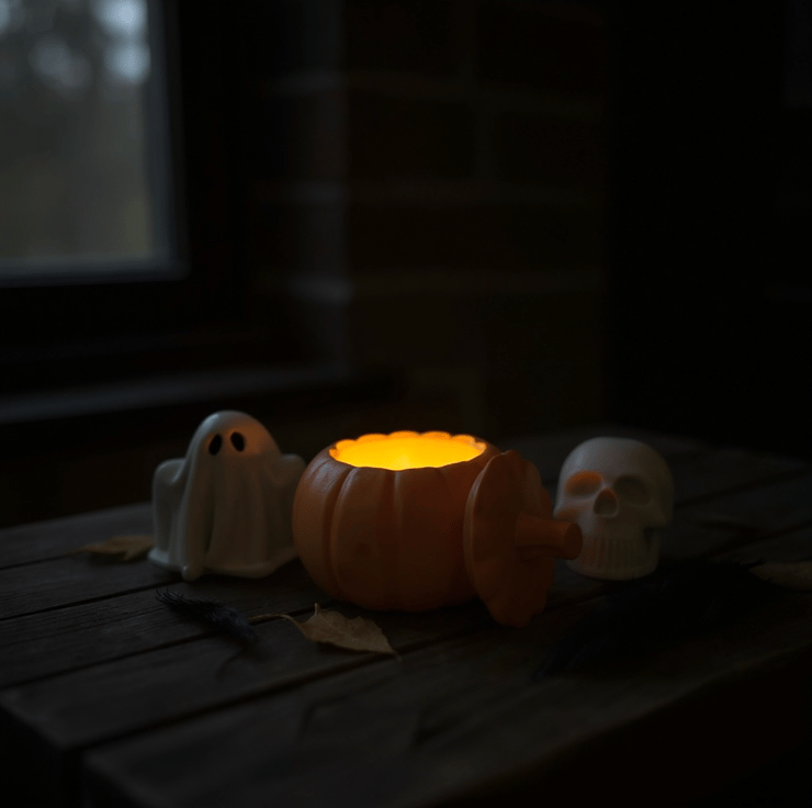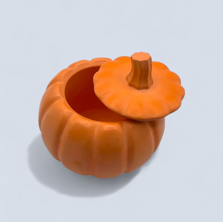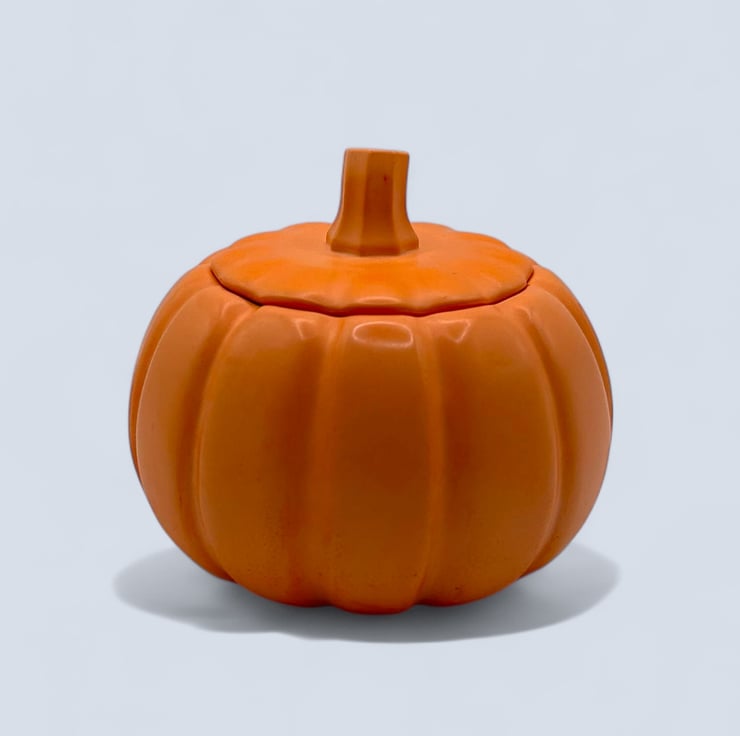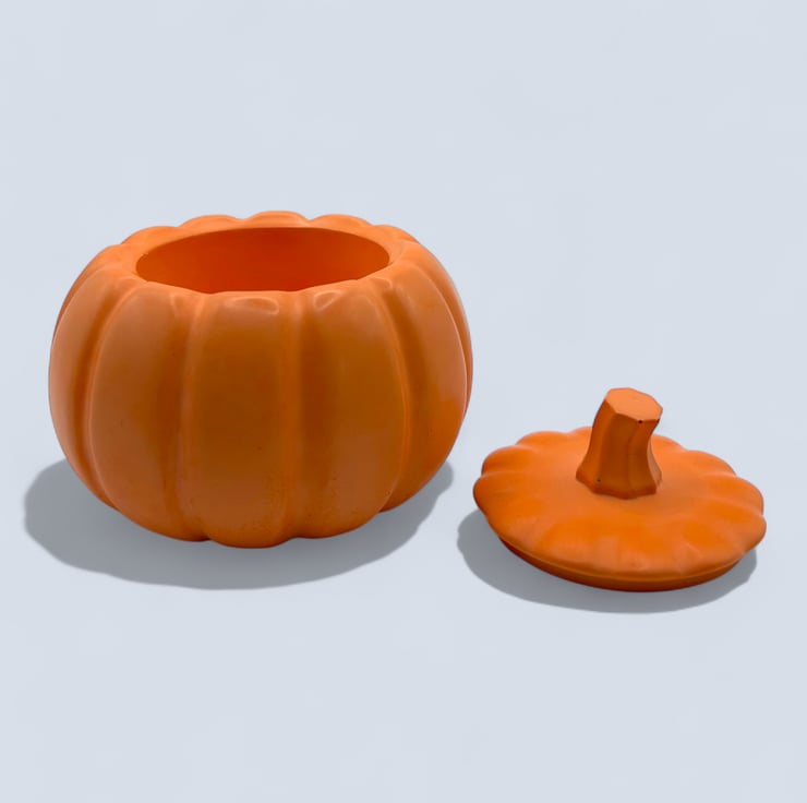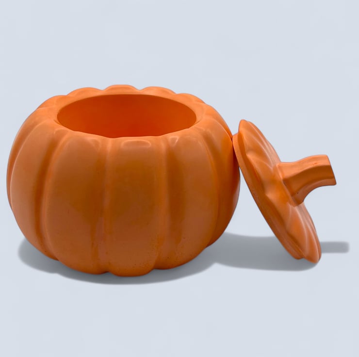 This orange pot is designed in the shape of a pumpkin with the stalk on the lid acting a convenient handle. The body of the pot features vertical segments reminiscent of a real pumpkin. Crafted from Crystacast, this trinket pot features a dense, smooth texture reminiscent of marble and a luxuriously weighty feel. It is perfect for storing keepsakes or trinkets or looks great lit up with a tea light or small pillar candle inside. The pot is not only functional but its pumpkin shape means it will also make a fantastic Halloween decoration.