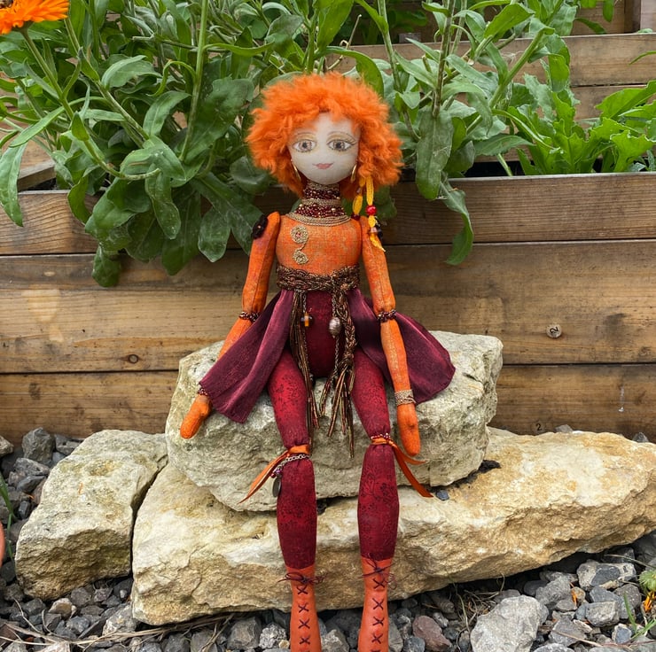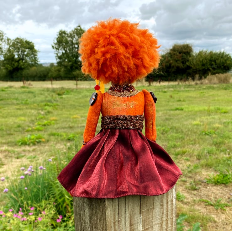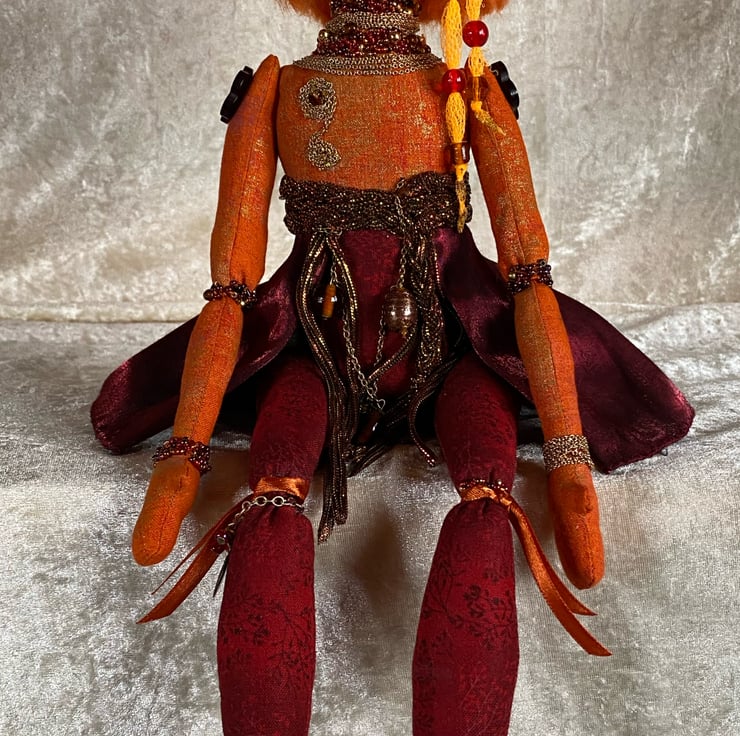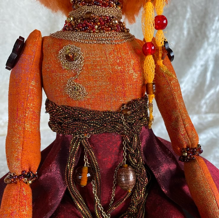 Have you ever felt that you could drink in colour? That colour feeds you in subtle (and not so subtle) ways? I love having rich colours around, and reds and oranges are at the top of my list. This doll was a joy to make for me - beautiful colour, enhanced by beadwork.