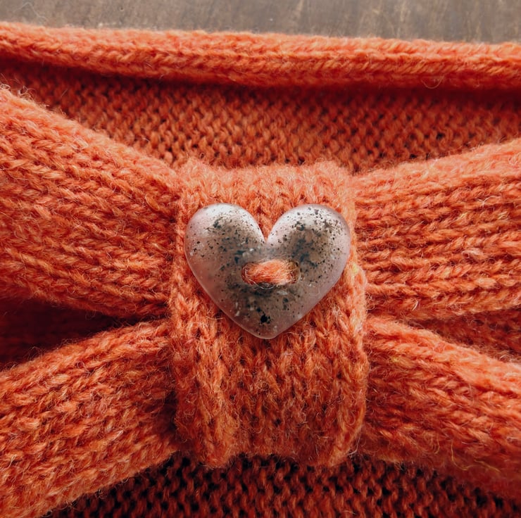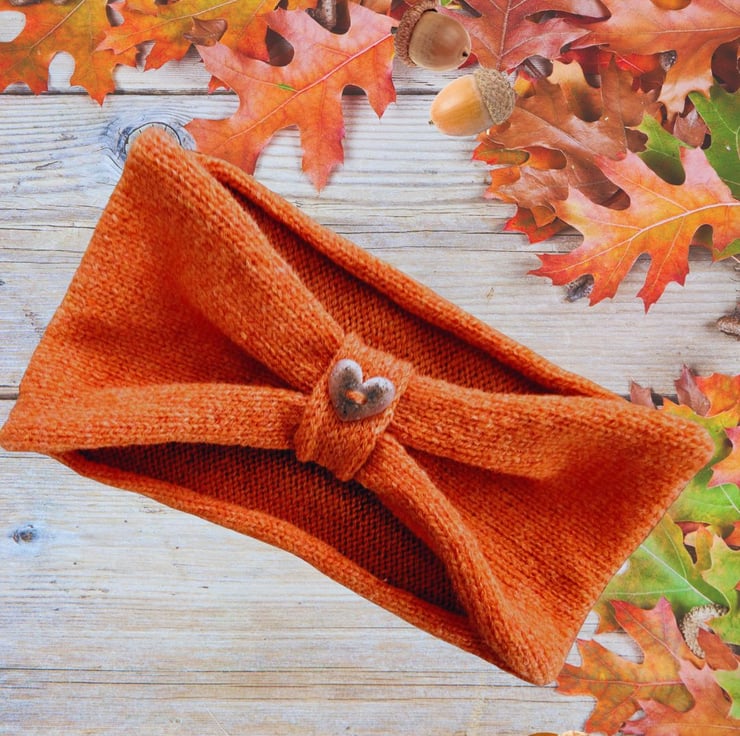 Experience the ultimate blend of style and comfort with this gorgeous burnt orange knitted Headband, Ear Warmer. These comfy headbands are knitted in a beautiful lightweight and super soft lambswool spun in a traditional method in Scotland. Each piece is decorated with one of my signature buttons made from resin and sand, adding a unique and artisanal touch. Perfect for keeping you warm while adding a splash of autumnal colour to your wardrobe.