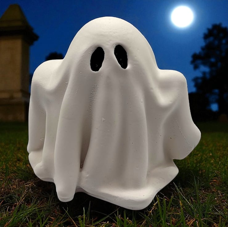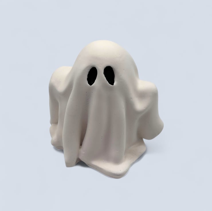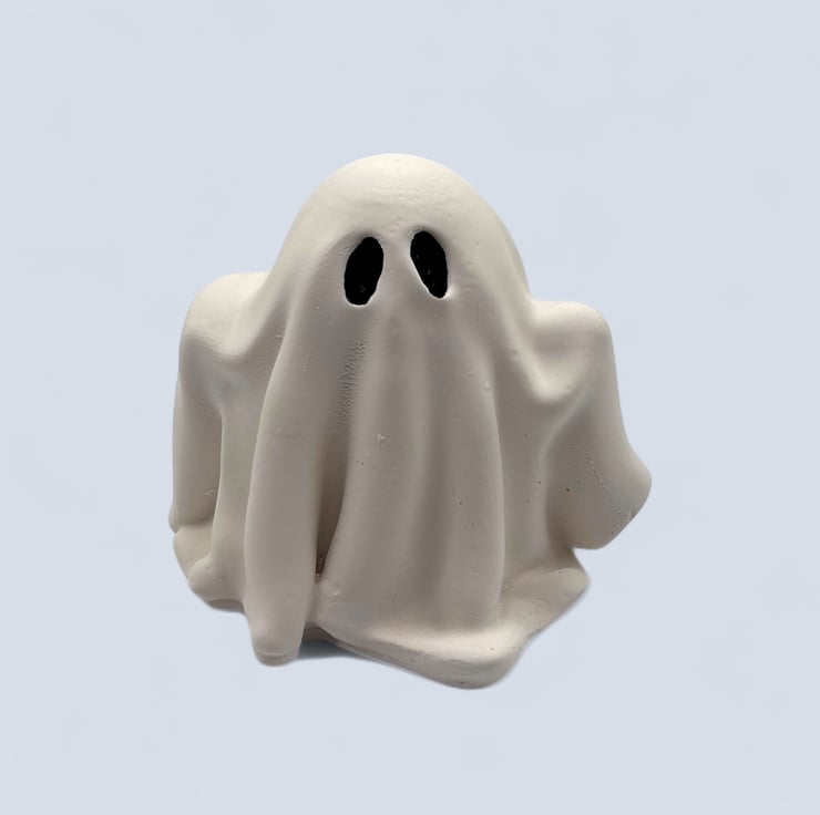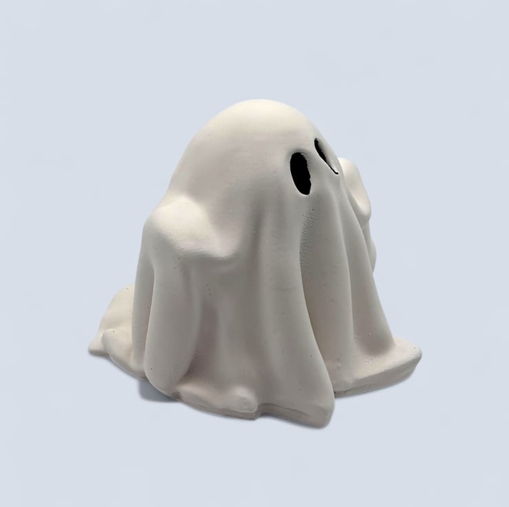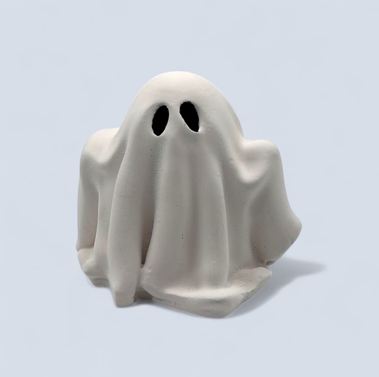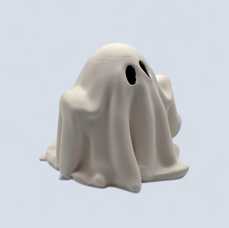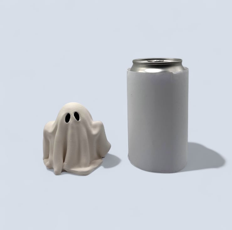 Each ghost is created by pouring plaster into a mould, giving it a smooth stone like surface and a solid weight. Made from Crystacast, it sets hard and durable while preserving the folds of the flowing sheet design. Dimensions are approximately 7 cm tall, 9 cm long and 7 cm wide. For scale reference, one of the photos shows this white ghost placed next to a standard drinks can.