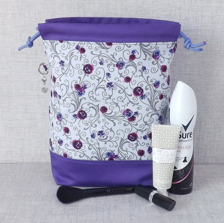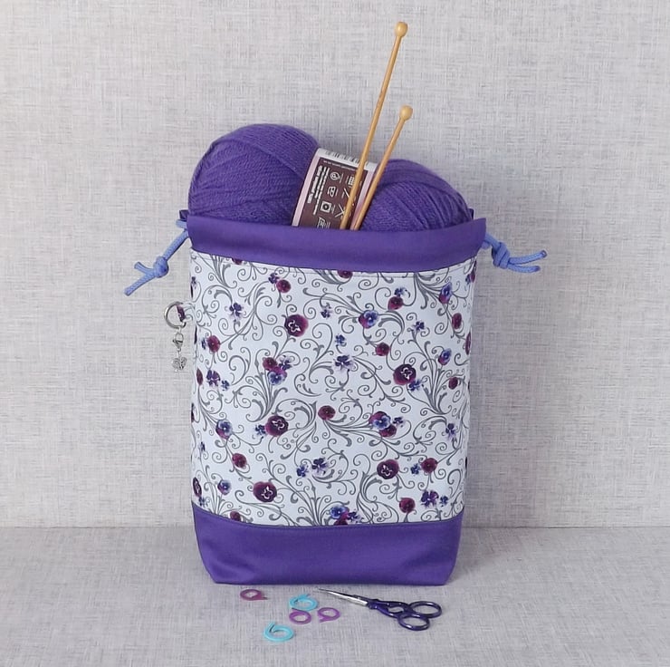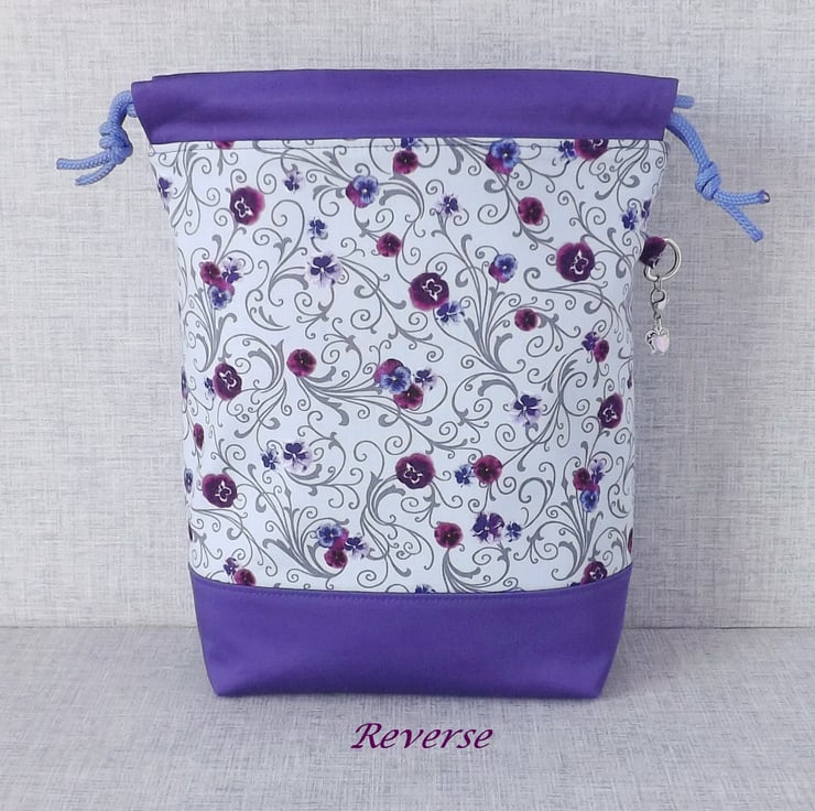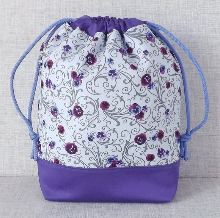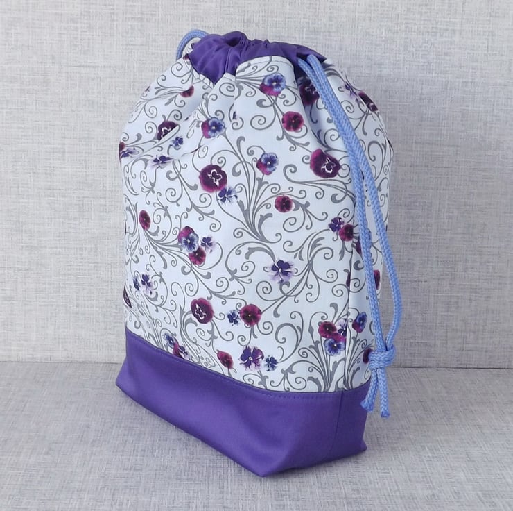 A project bag, drawstring bag, made from a lovely cotton fabric with a floral design in shades of purple, magenta and silver grey on a light grey background, combined with a plain purple cotton fabric. The lining is a tonal fabric in shades of magenta & purple.