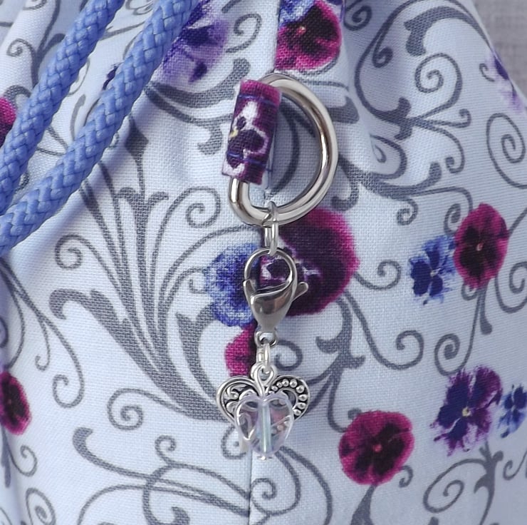 I have included a heart charm/stitch holder which is attached to a D ring on one side of the bag, and the bag closes with drawstrings.