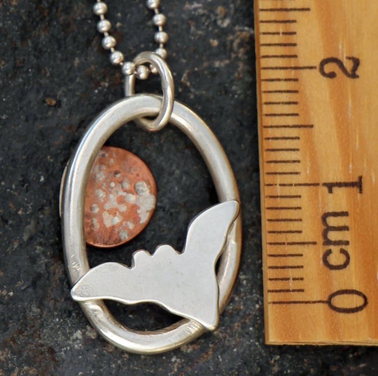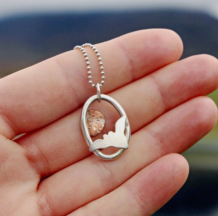 Handcrafted from recycled silver and copper, this striking pendant features a bat silhouetted against a textured copper moon. Each element is hand-pierced using traditional jewellery saw techniques. The moon is hammer textured with a touch of molten silver. Set on a silver frame and finished with a jump ring.
