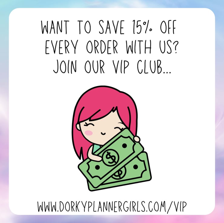 If you would like to save 15% off your order with us, please visit our website to join our VIP email group. www.dorkyplannergirls.com/VIP