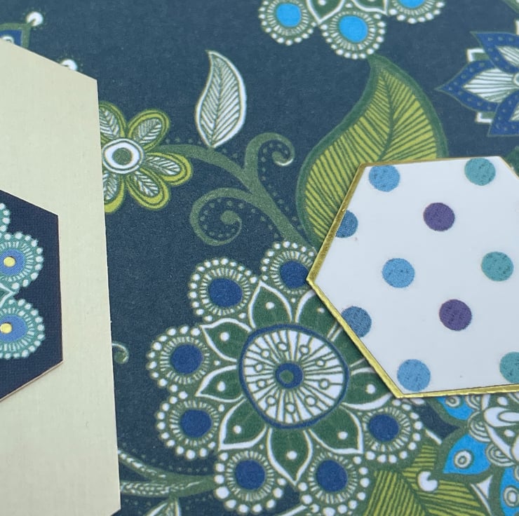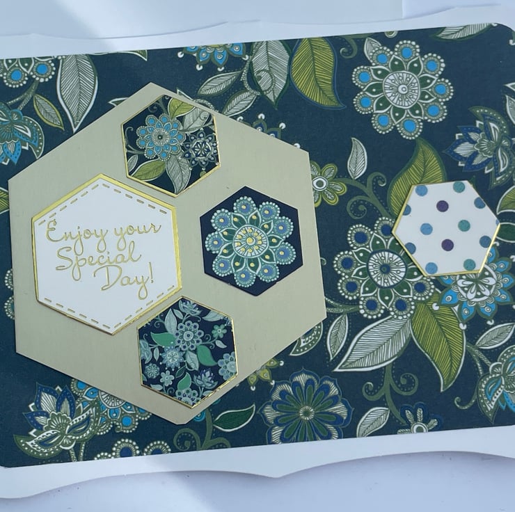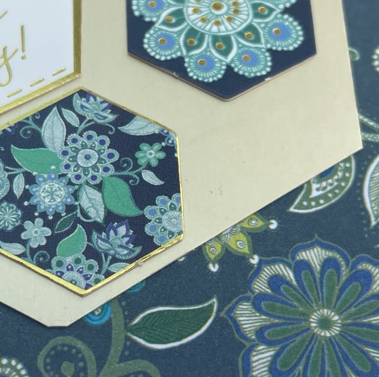 A pretty little patchwork themed card for a birthday. This A6 sized pretty label shaped card features different hexagons in different patterns. The background paper features a deep teal colour topped with leaves and flowers in a mandala style. This is topped with a gold hexagon which is decorated with matching patterns. The greeting is Enjoy your special day. Inside the card there is a matching hexagon which says Just for you. Ideal for a birthday but could be used for other occasions.
