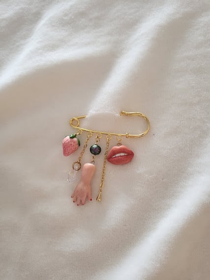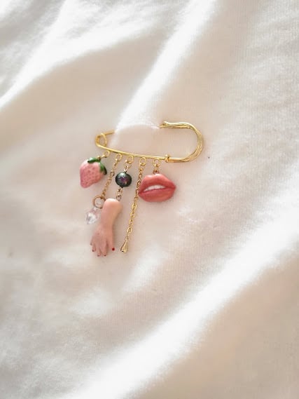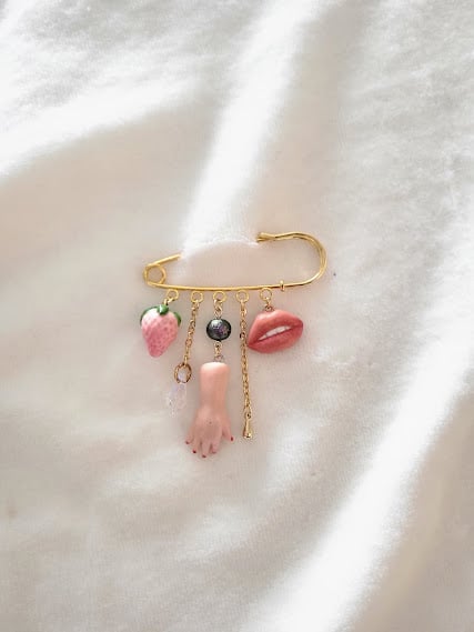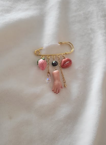A whimsically macabre piece that's sure to be a conversation starter. This gold-toned safety pin brooch features an assortment of playful yet peculiar charms. A realistic hand, with its fingers gently curled, dangles from the centre. It's perfectly complemented by a glossy, blush-pink strawberry and a pair of luscious red lips. The dark, iridescent pearl and sparkling crystal add an element of gothic charm. This brooch is perfect for those who want to add a touch of playful strangeness to a jacket, bag, or sweater.