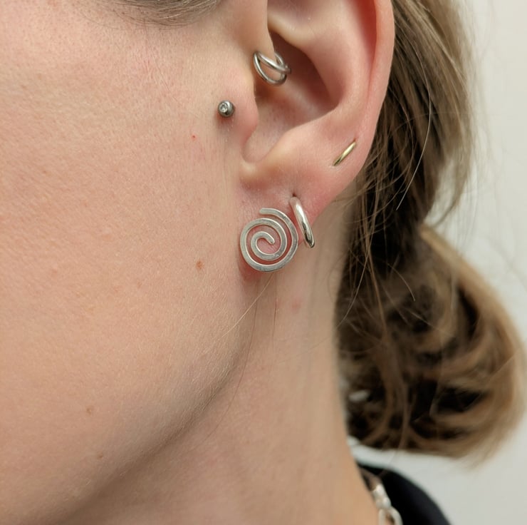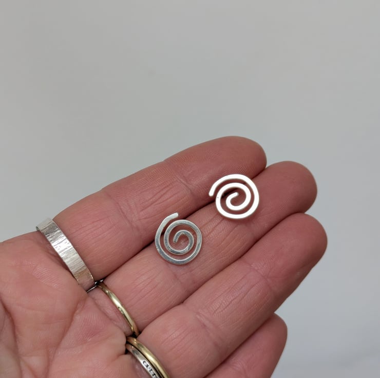 Sterling silver stud earrings, in a freeform spiral design. This is a one off pair, the item pictured is the one you will receive. Delivered in a gift box with tracked postage.