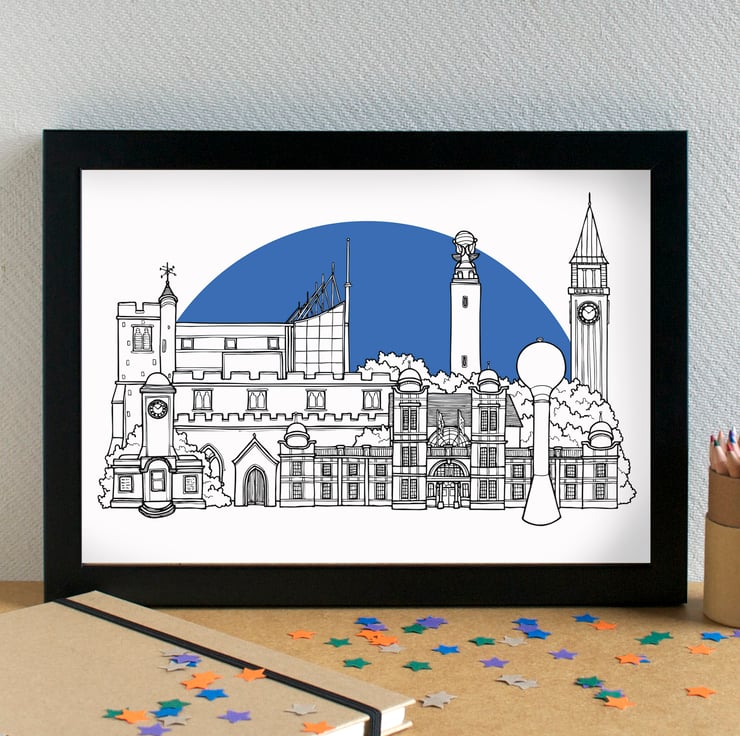 A black and white print of my cityscape illustration of the most famous landmarks in Gillingham, Kent. The image features the homeground of Gillingham FC, Priestfield Stadium, and has a background of Gillingham FC blue.