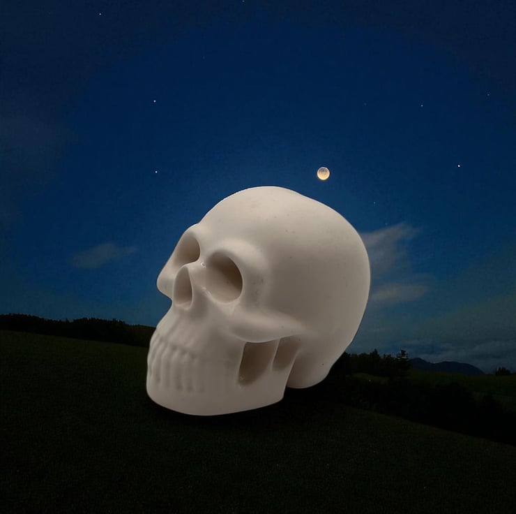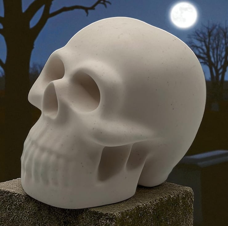 This small white Halloween skull decoration is handcrafted from Cassini material. The skull is both water- and weather-resistant, making it suitable for indoor and outdoor display. This eerie piece is left unsealed, allowing you to paint it to match your spooky aesthetic if desired; however, it also looks great as is. This tiny skull ornament will add a touch of the macabre to your Halloween decorations this year.