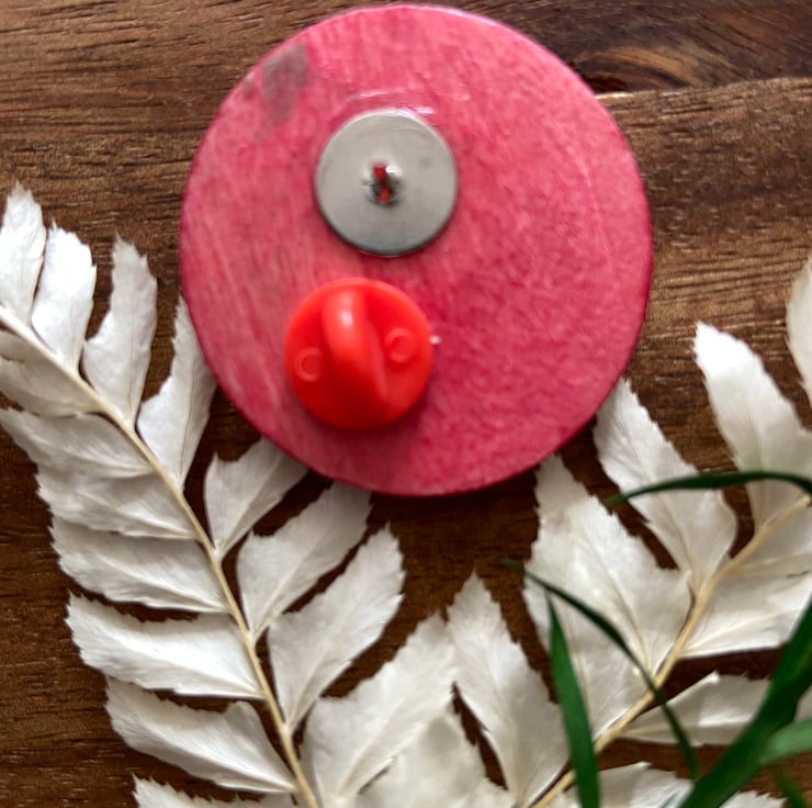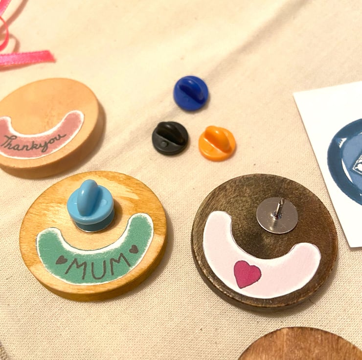 The wooden pin is 3.4cm in diameter. It's presented with card board backing when folded is 10.5cm length and 7.3cm width. It is gift wrapped in a card folder with a ribbon which you can untie and write your own message. I include a free notelet if you don't want to write on the brooch packaging. If you want to say a message on the back there is a list of ready made ones for you to choose. If you want a particular name to be added on the back then contact me via the "Note to seller" option at checkout . Thanks for looking at my brooches!