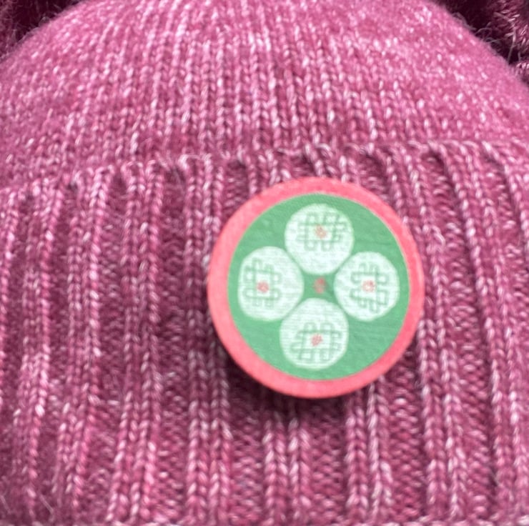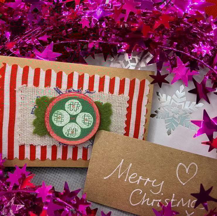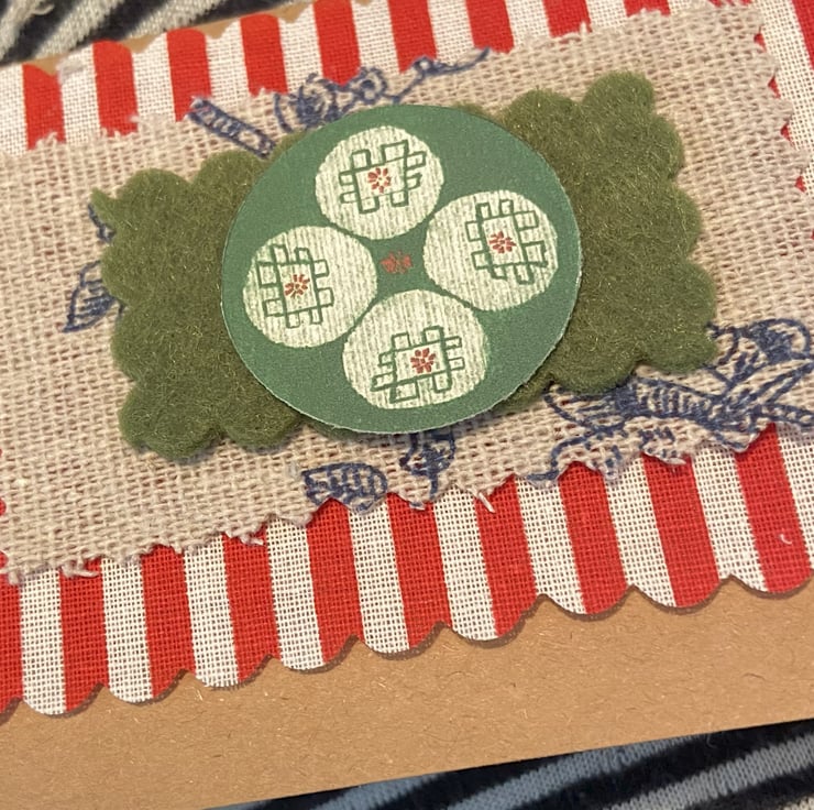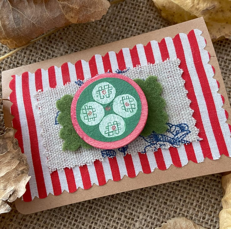 This is a floral design with a wintery white petals with a tiny pattern in the middle of each petal. This would finish off a Christmas outfit or a richly coloured winter jumper. I printed the design onto wooden transfer paper and hand painted the wooden disc with a blue water colour. I varnish it before and after placing the wood transfer. I also enjoy matching the fabric I use for the brooches display card.