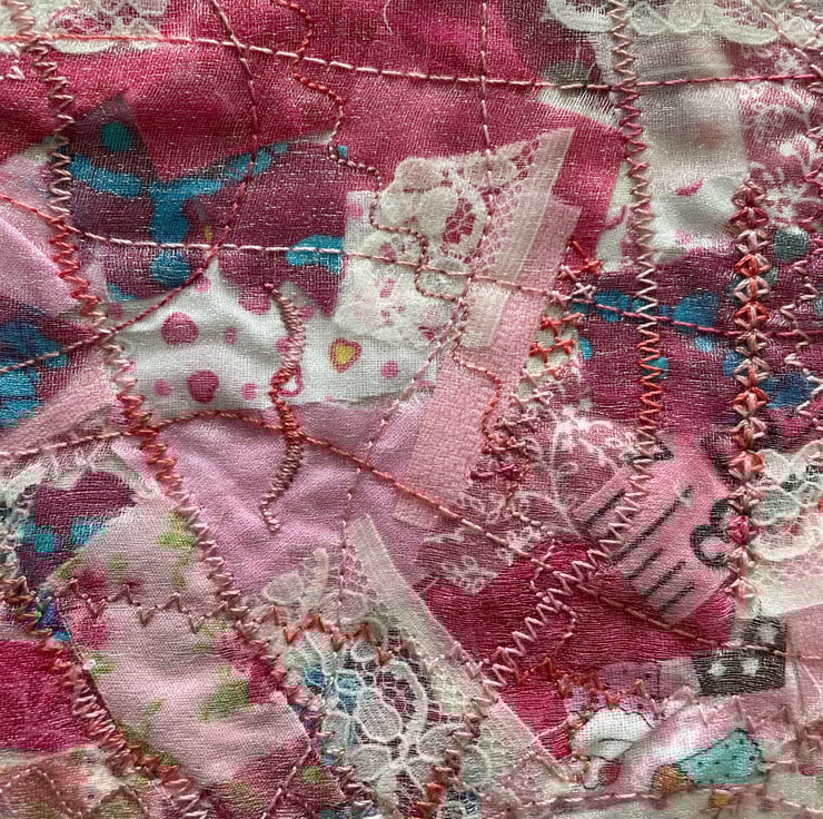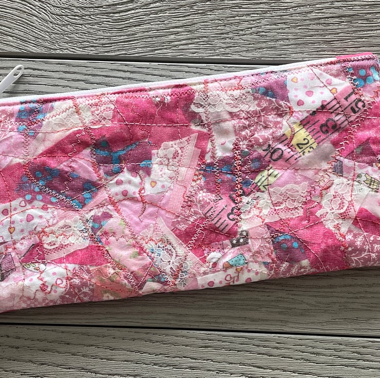 This pretty zipped pouch is created from small scraps of cotton fabric in shades of mainly pink, white and blue, sandwiched between a layer of calico and white organza and stitched in place with a variety of machine stitches in a variegated pink polyester thread. Pieces of cream lace and some zip waste and a piece of fabric with a tape measure design are also included in this new piece of fabric.