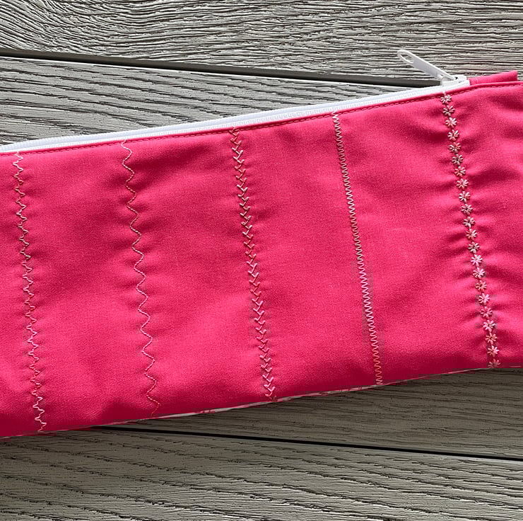 The back of the pouch is a plain piece of pink cotton embellished with a variety of machine stitches again in a variegated thread. The chunky white nylon all purpose zip forms closure.