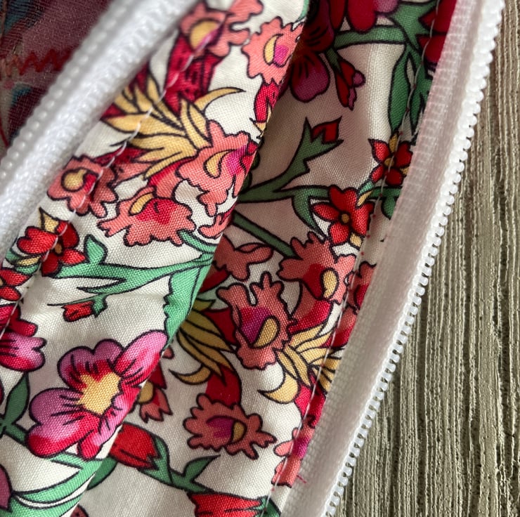 The white cotton lining has a design of foxgloves and other flowers in shades of pink, green and yellow.